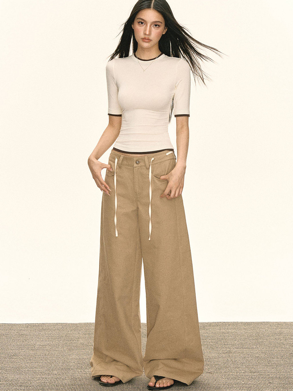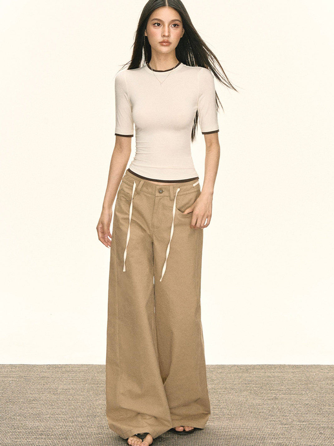ARISEISM | Khaki Wide-Leg Casual Pants With Drawstring Skip to content