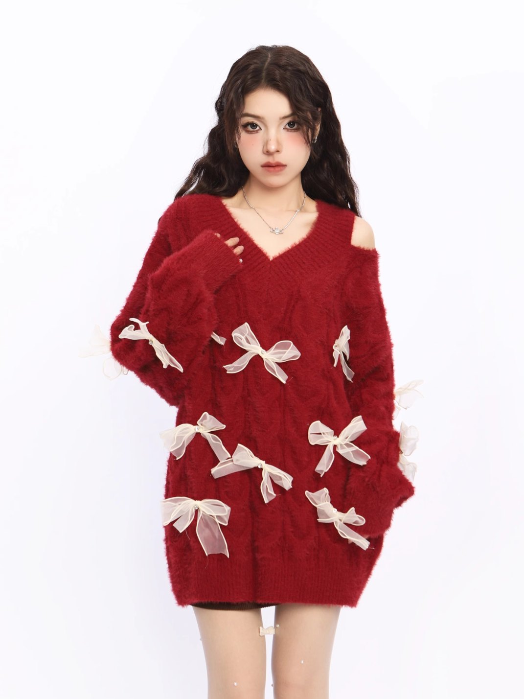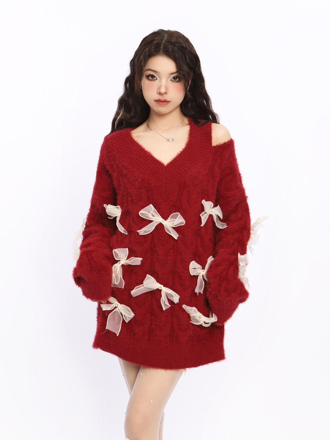 BIGGOLD | Off-Shoulder Red Bow Knit Sweater