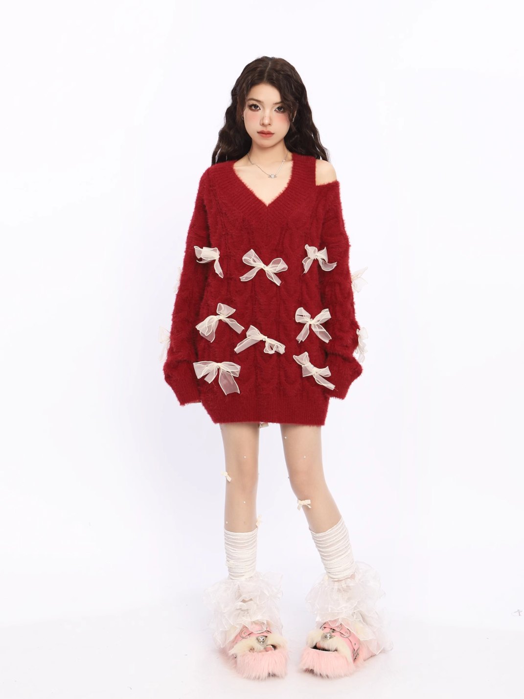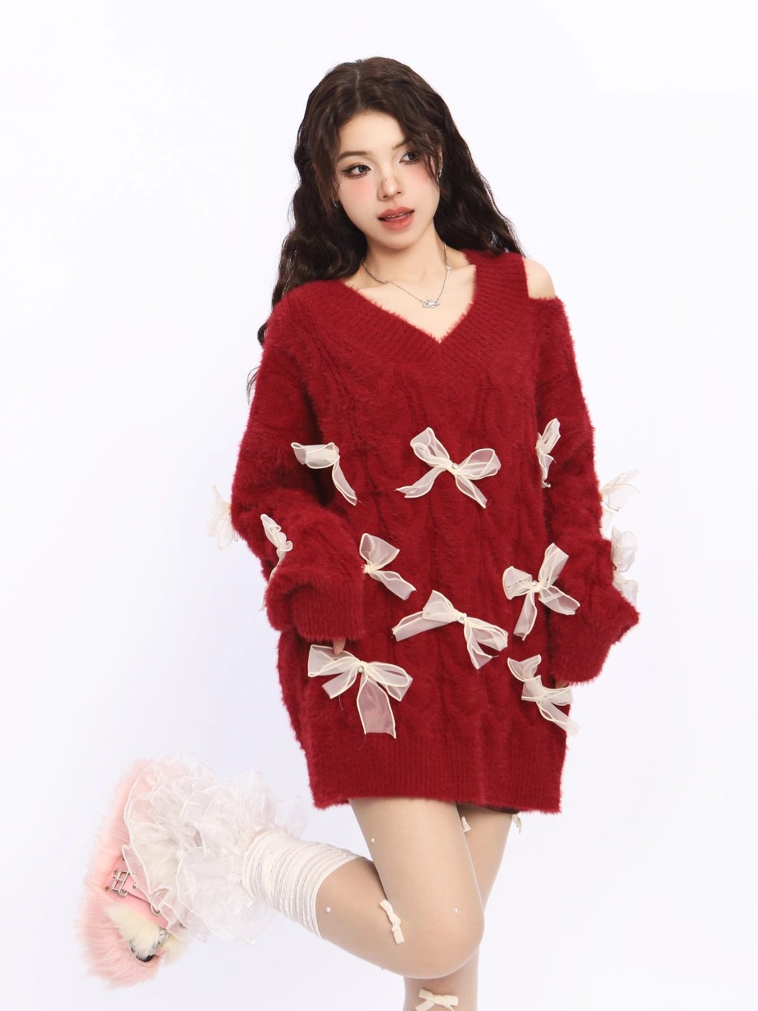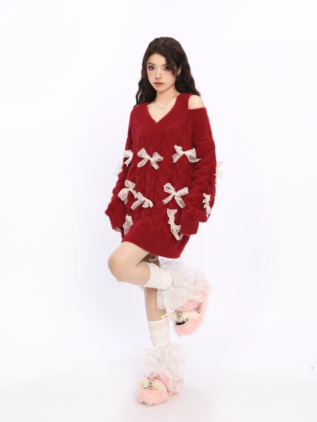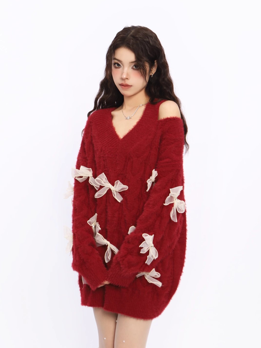 BIGGOLD | Off-Shoulder Red Bow Knit Sweater Skip to content