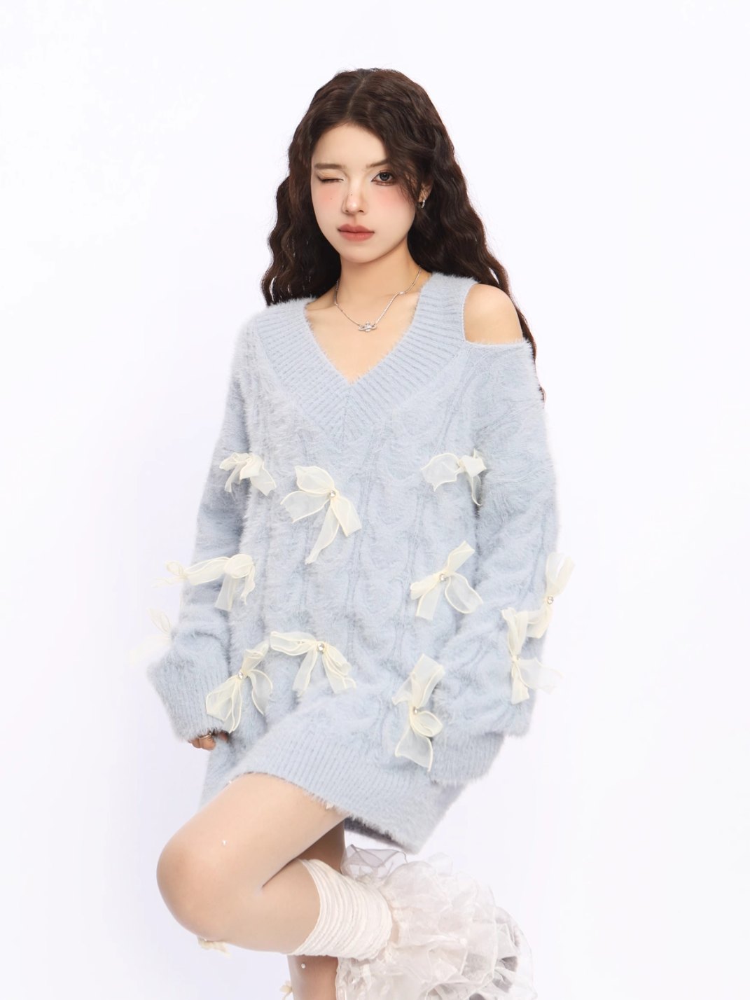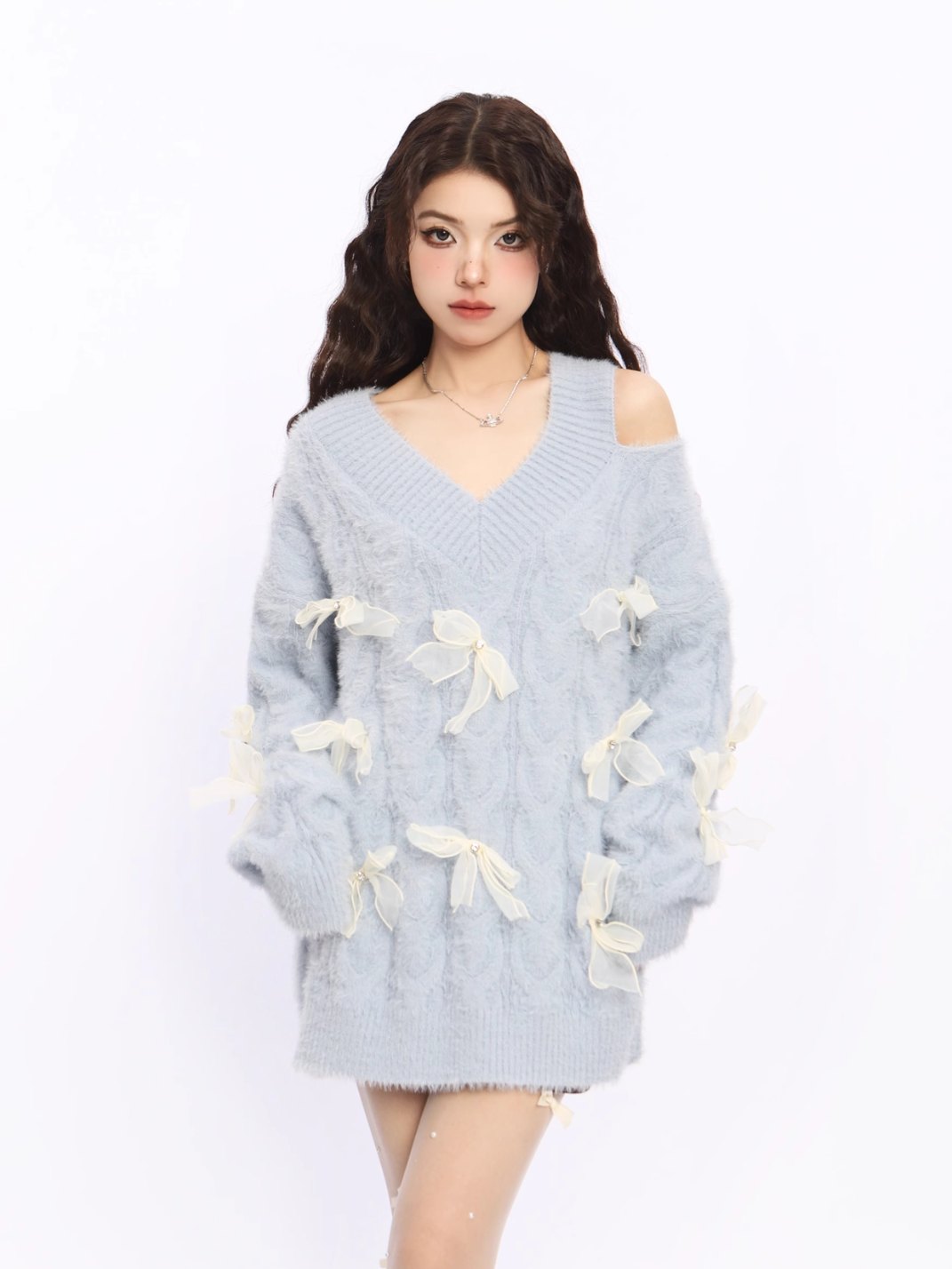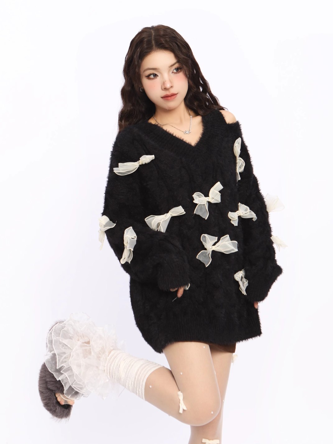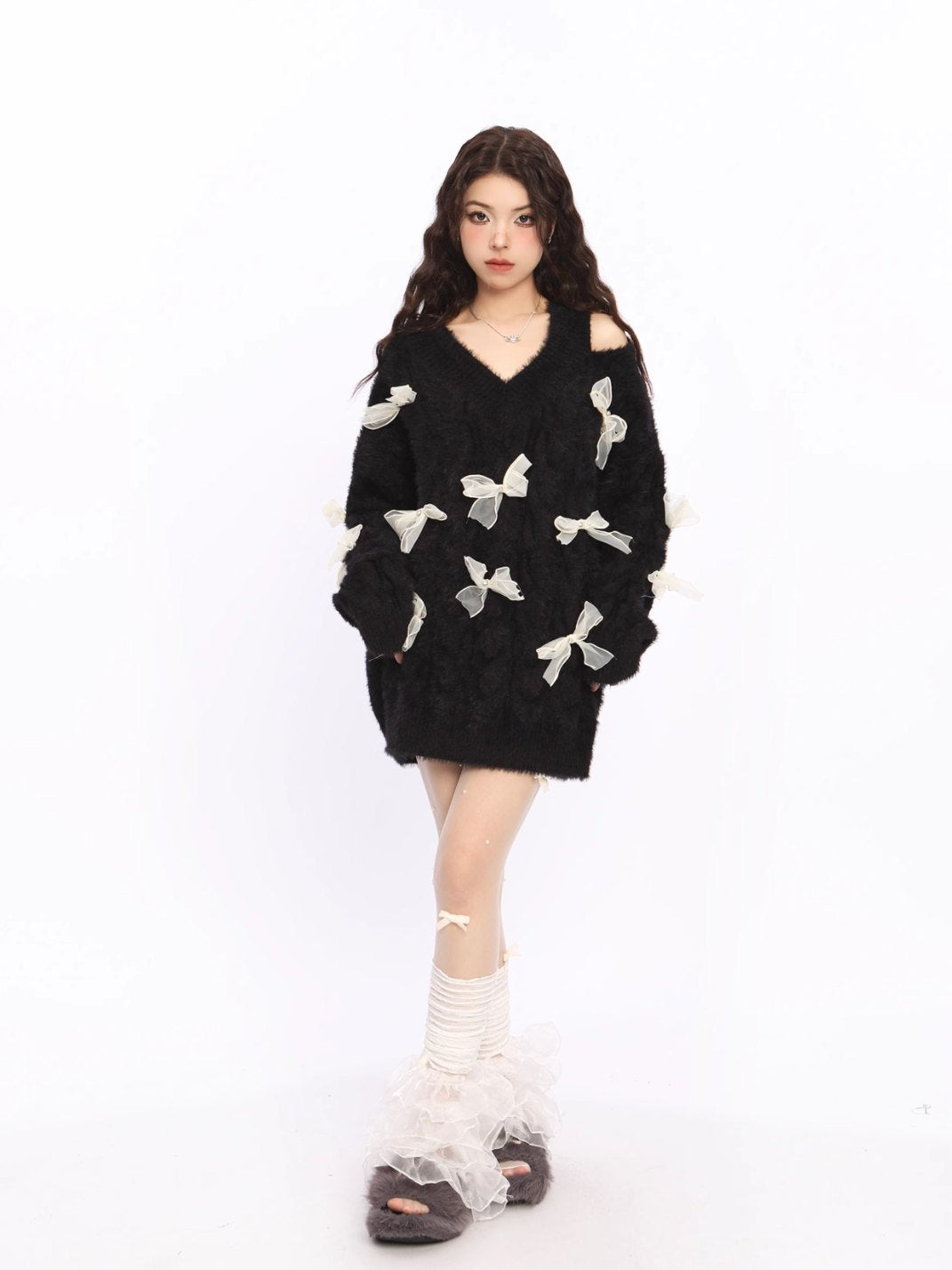 BIGGOLD | Off-Shoulder Red Bow Knit Sweater Skip to content
