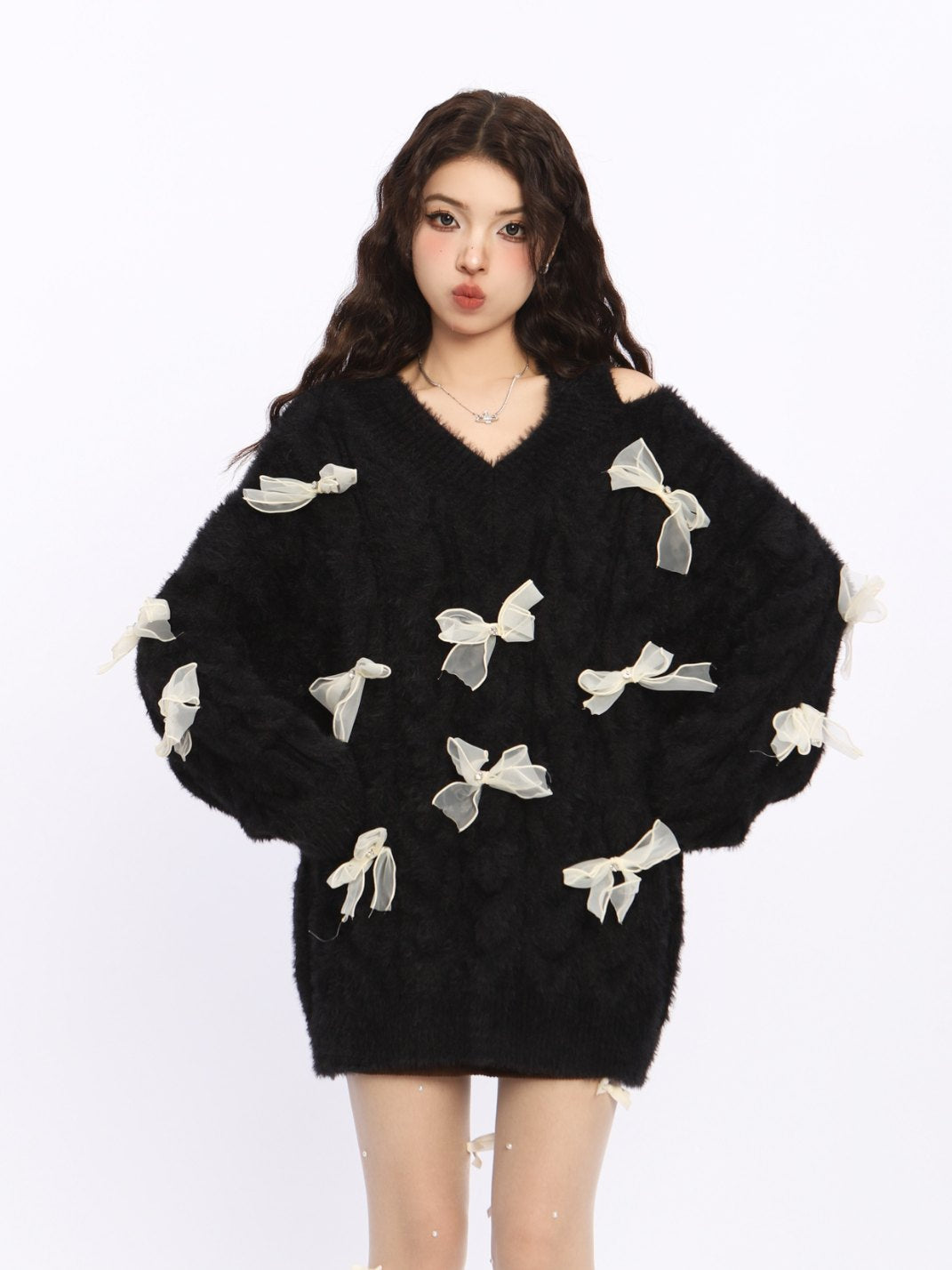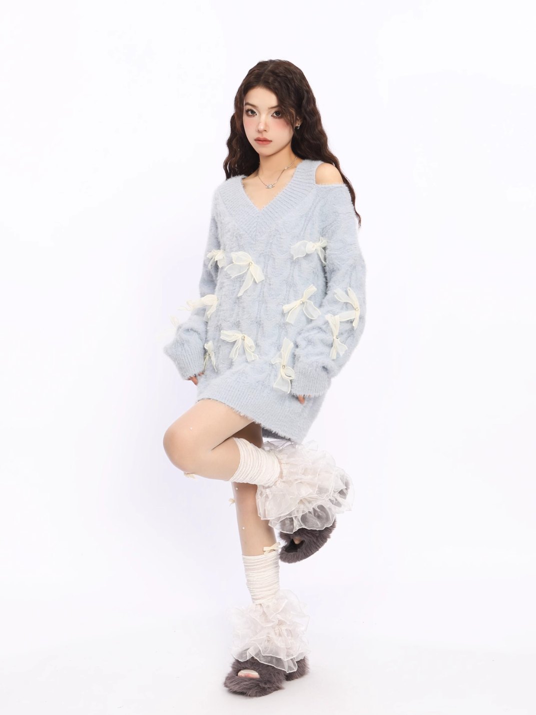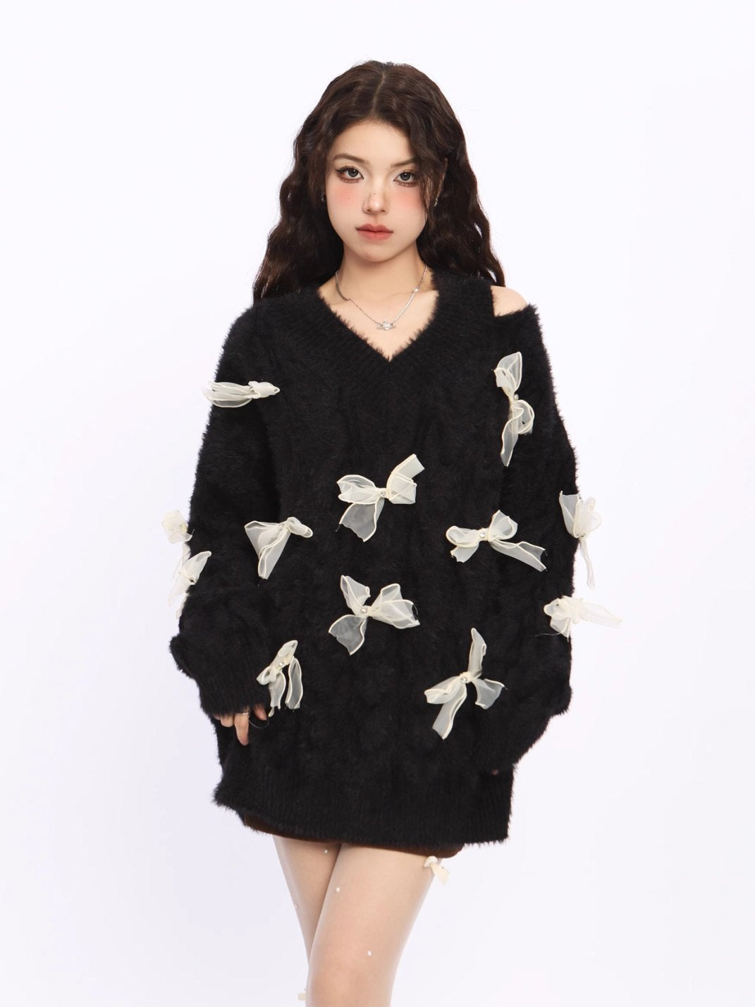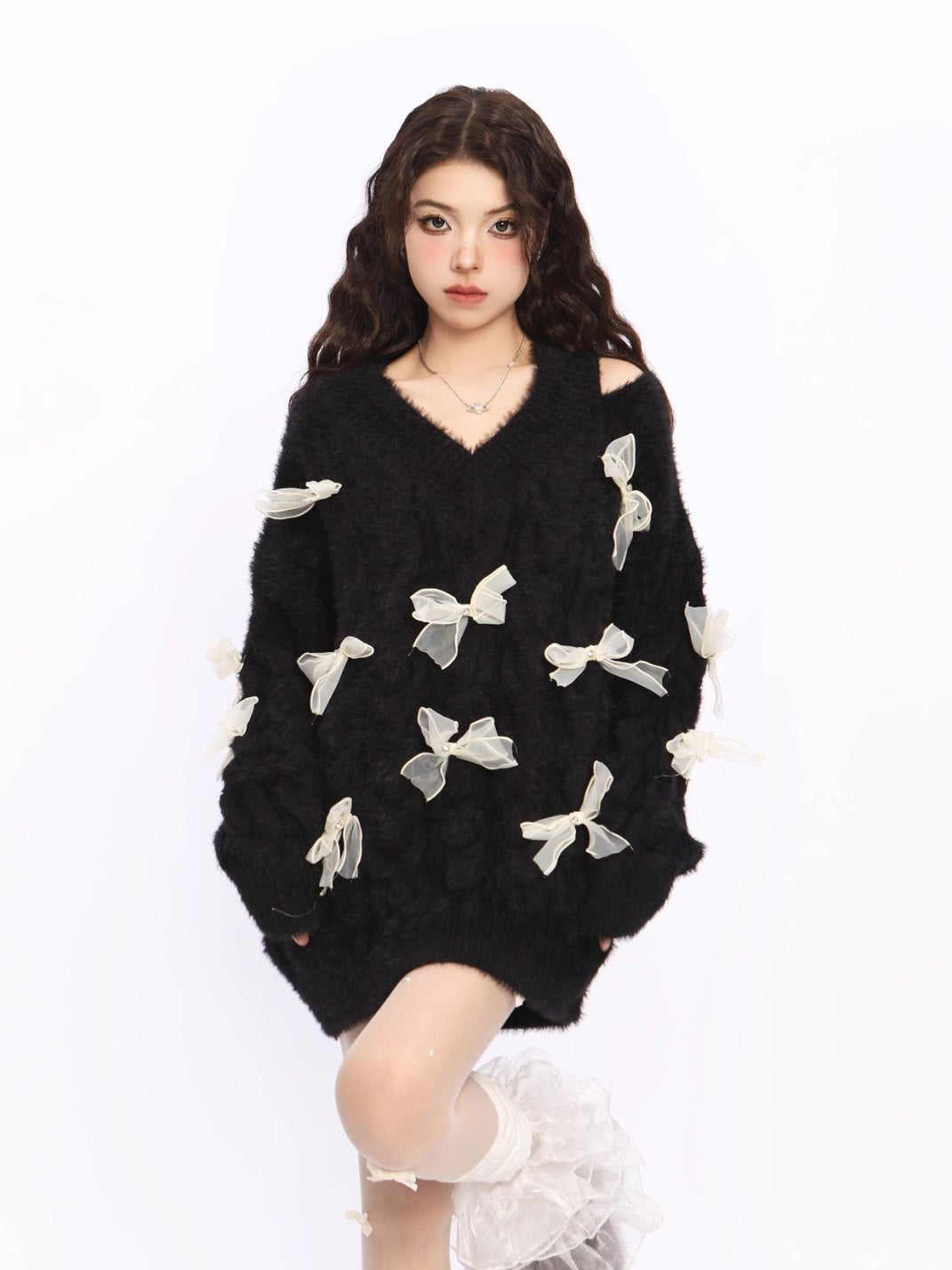 BIGGOLD | Off-Shoulder Red Bow Knit Sweater Skip to content