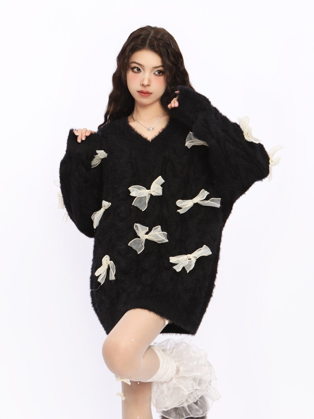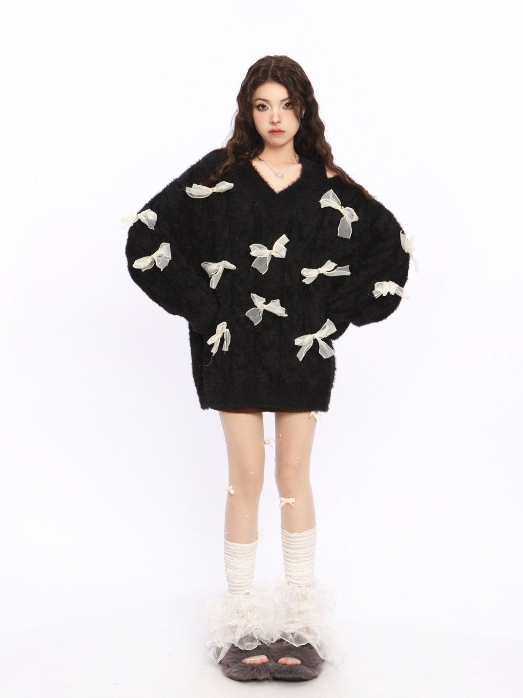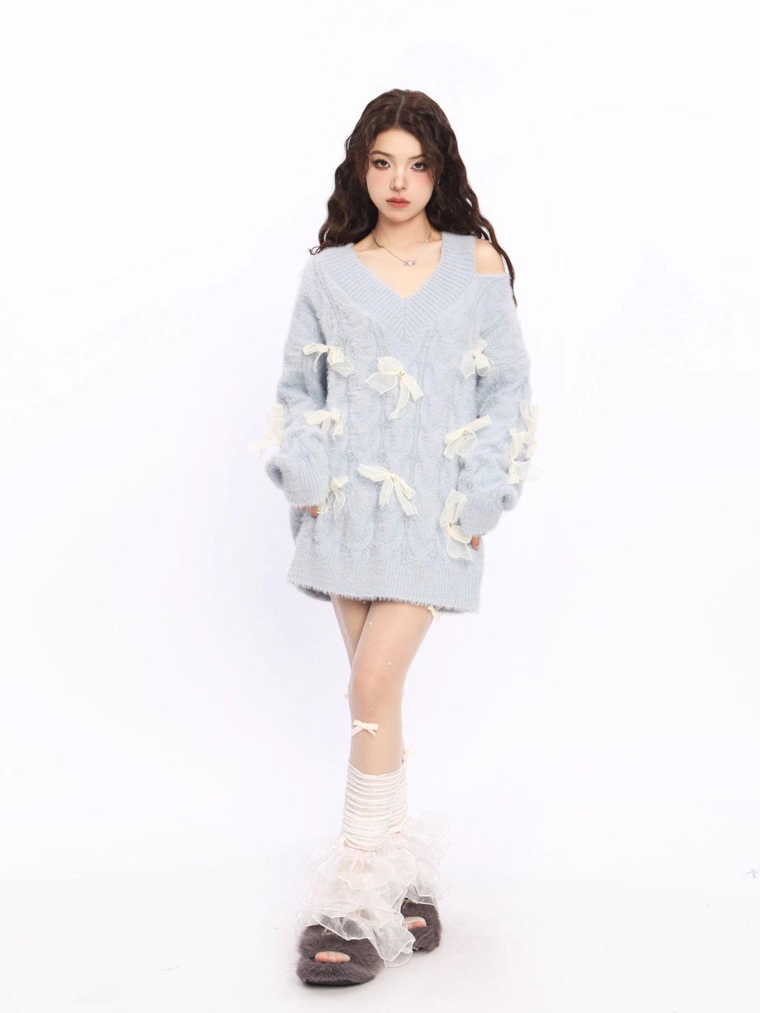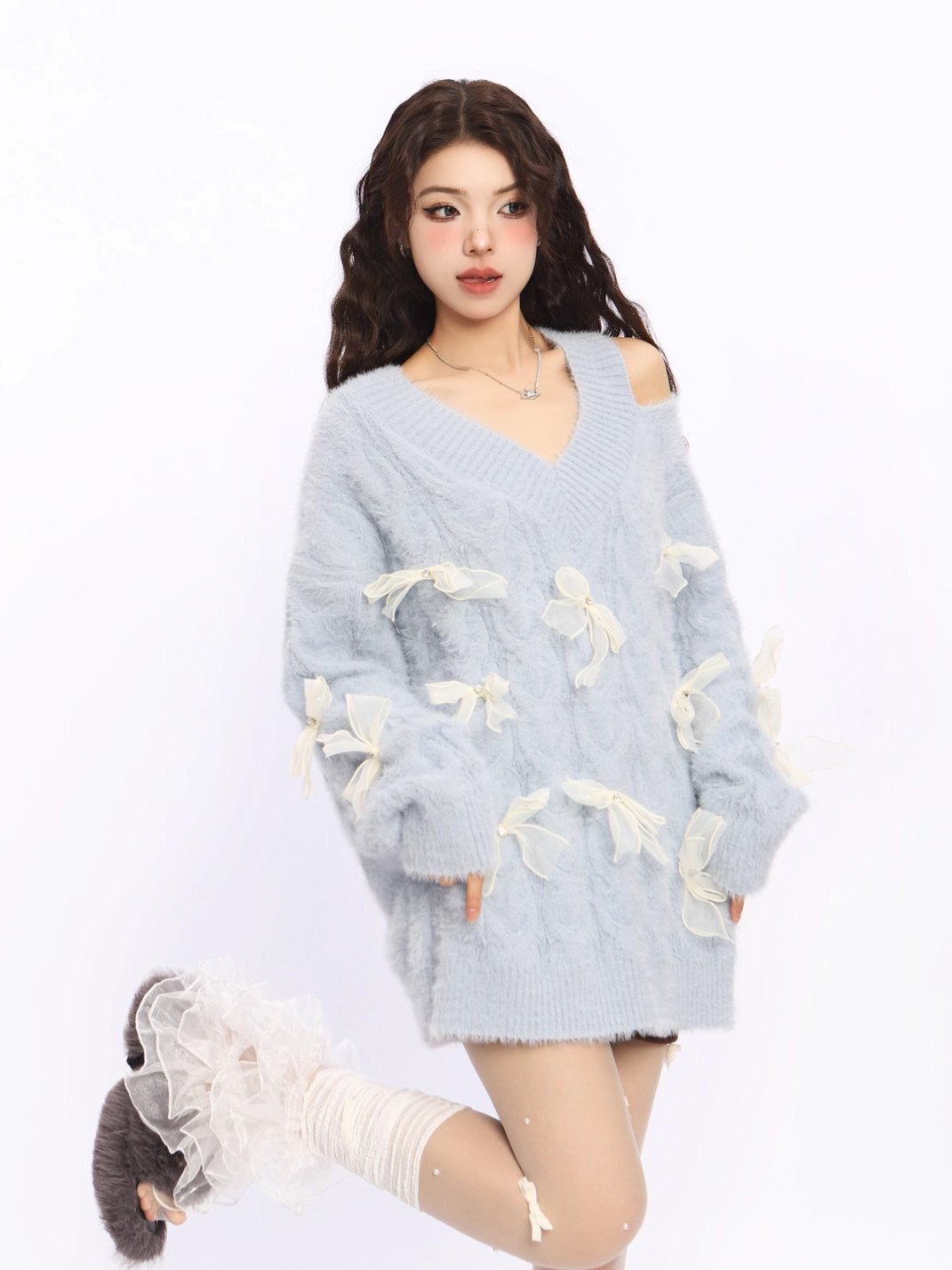 BIGGOLD | Off-Shoulder Red Bow Knit Sweater Skip to content