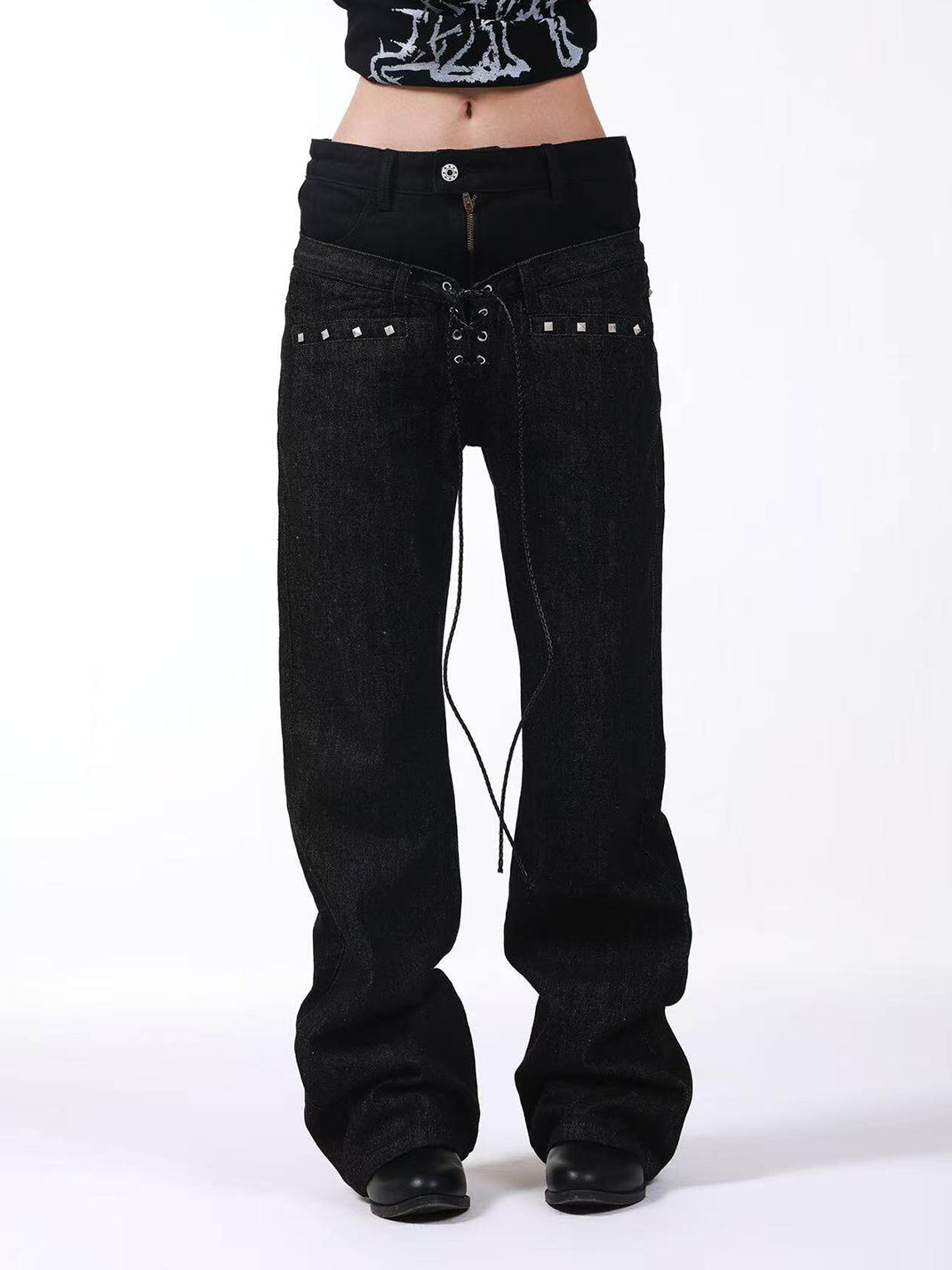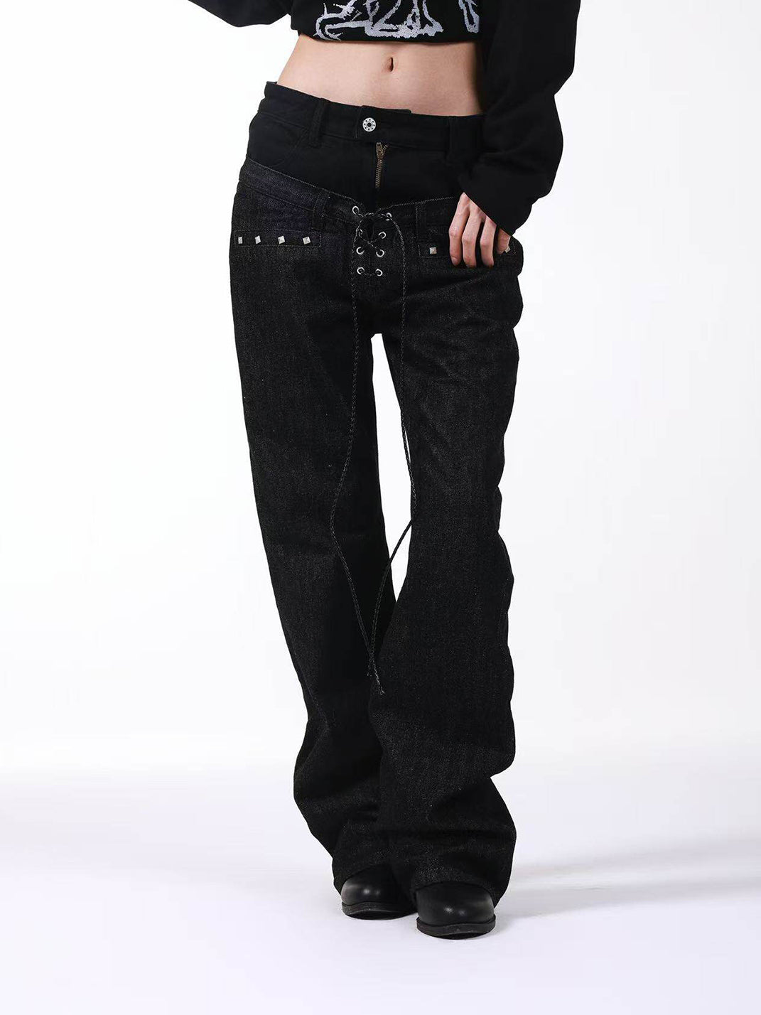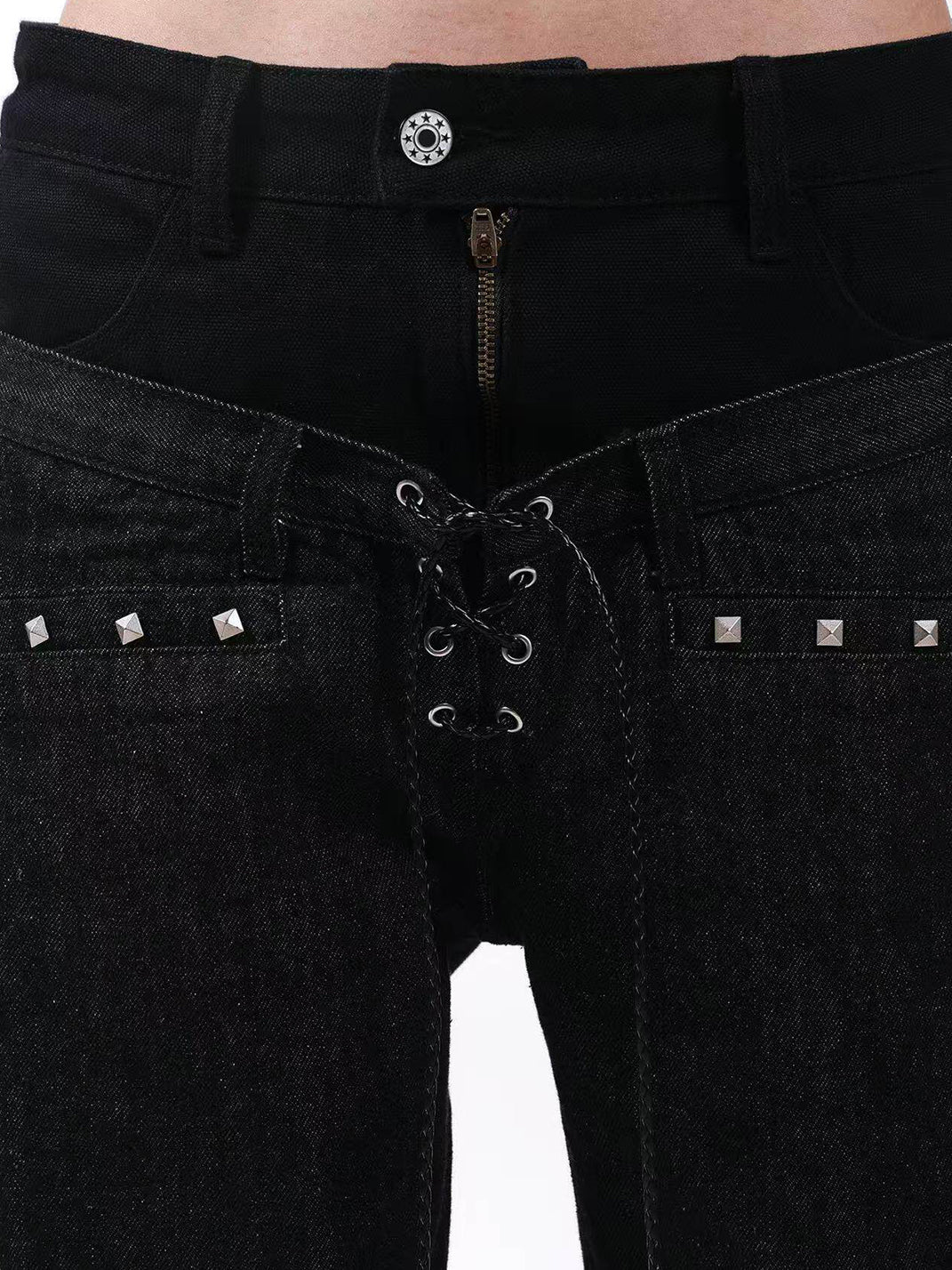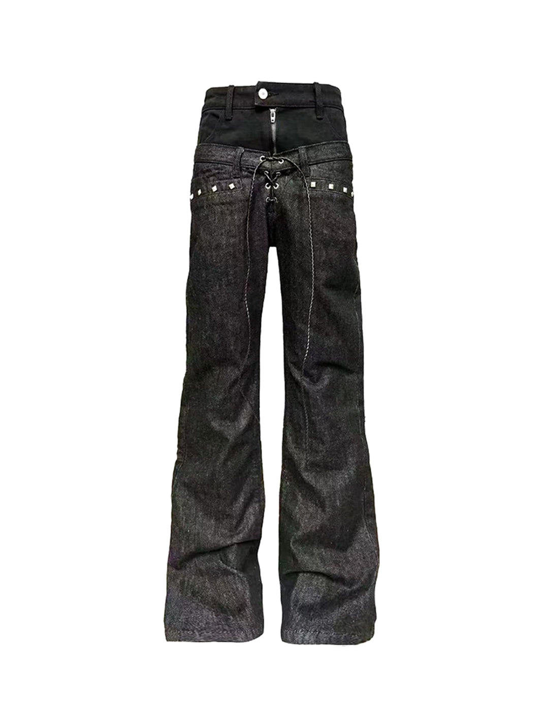 DETW | Double-Waisted Drawstring Zipper Studded Jeans