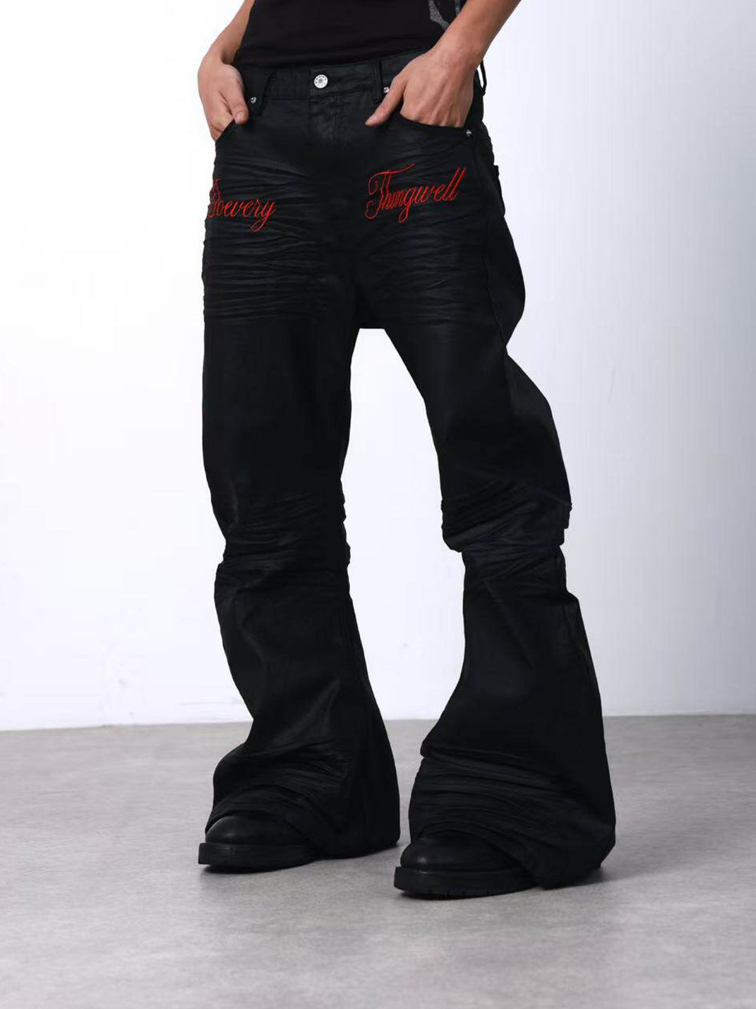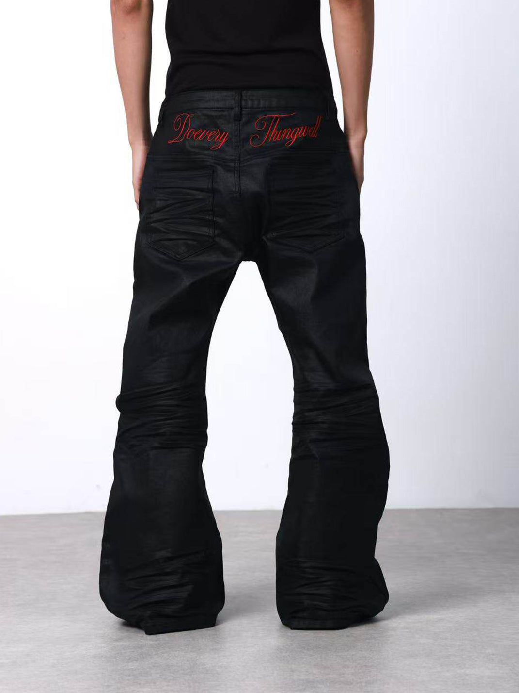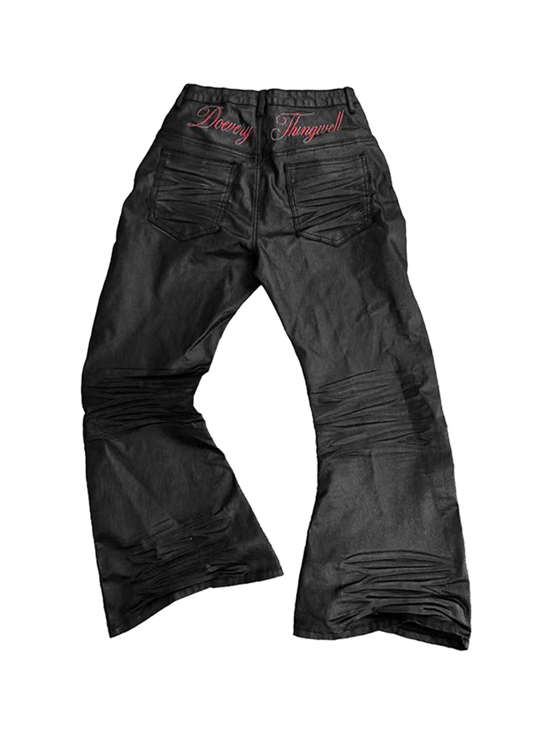 DETW | Waxed 3D Pleated Coated Flared Jeans Skip to content