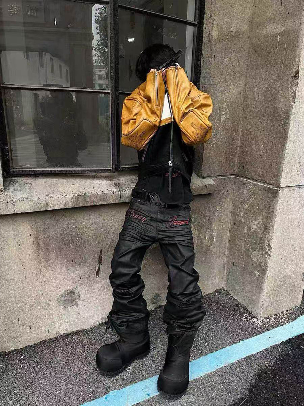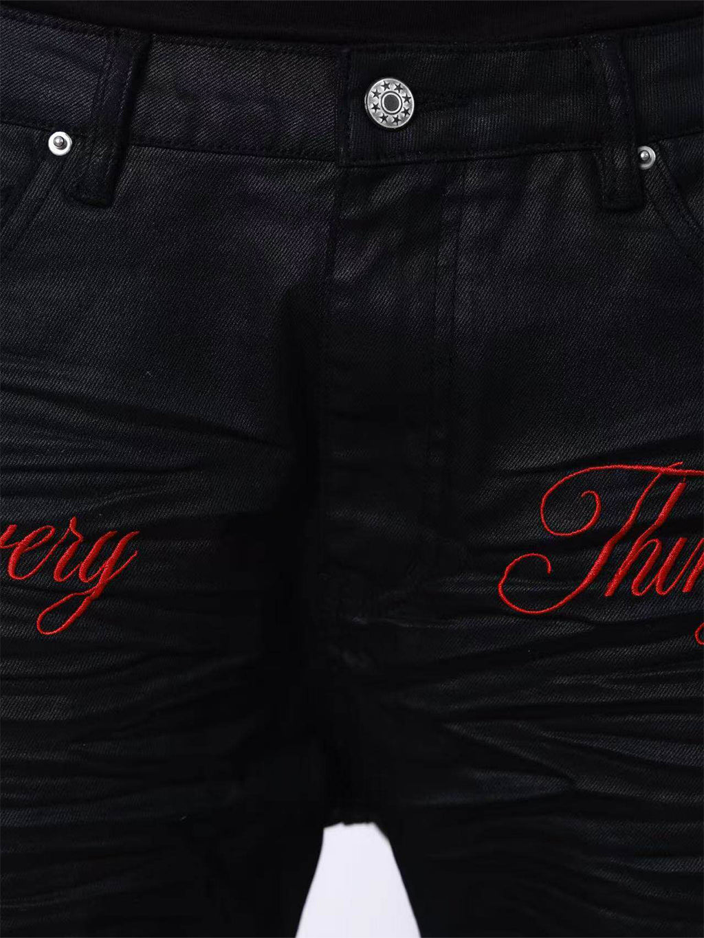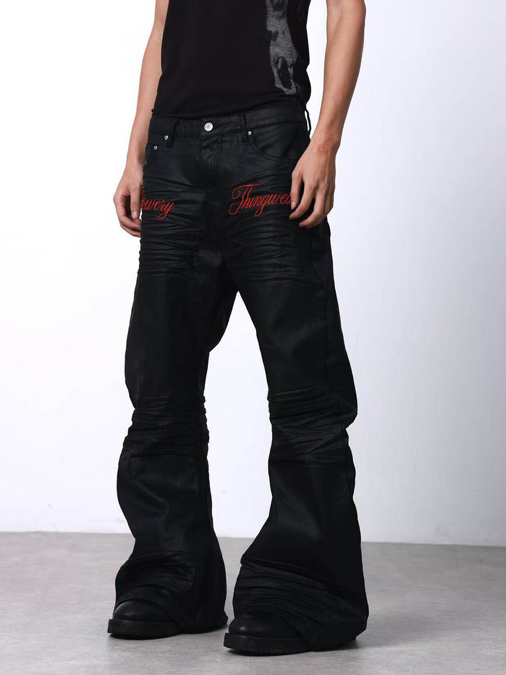 DETW | Waxed 3D Pleated Coated Flared Jeans Skip to content