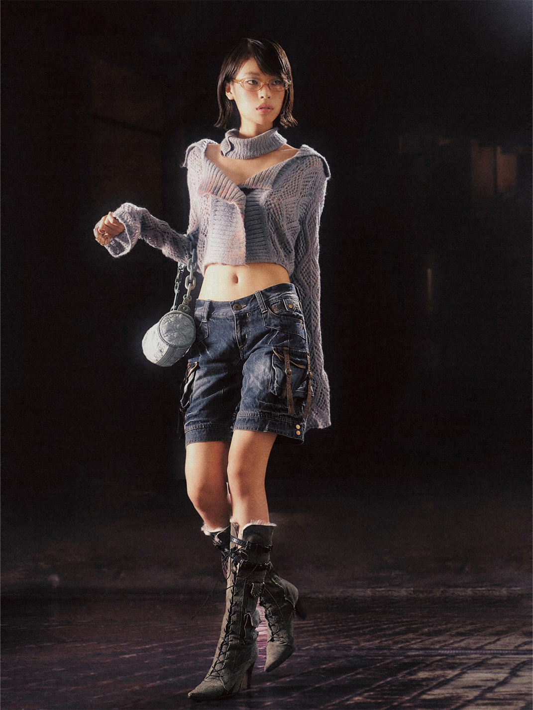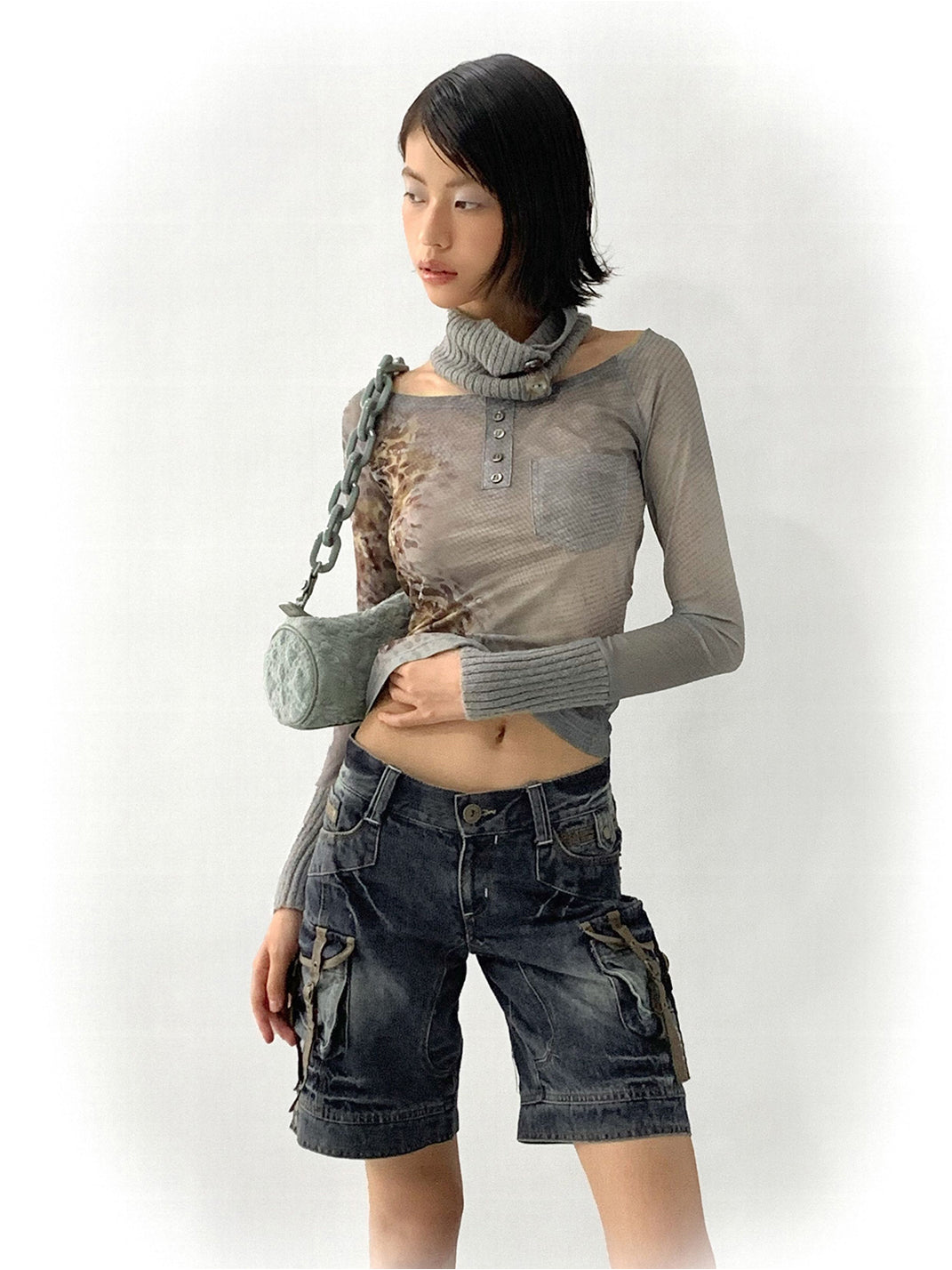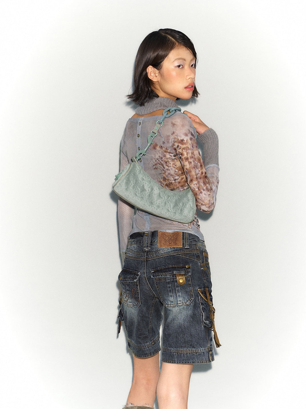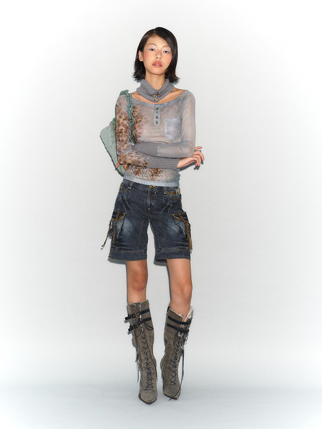 Flowers birds Market | Washed Blue Multi-Pocket Low Rise Denim Shorts