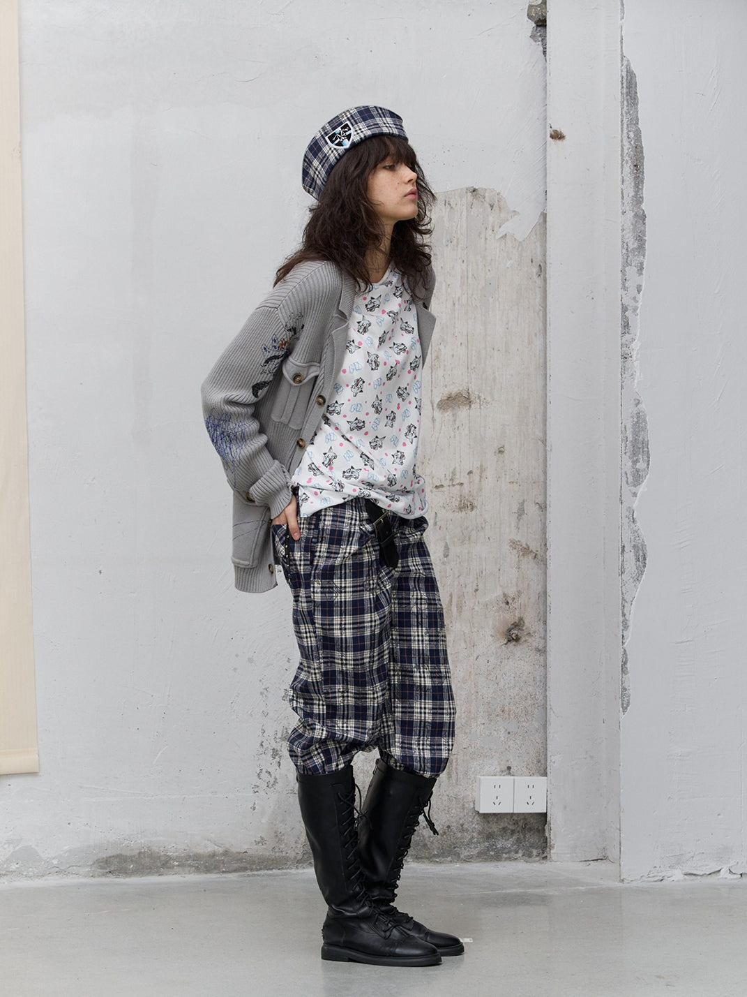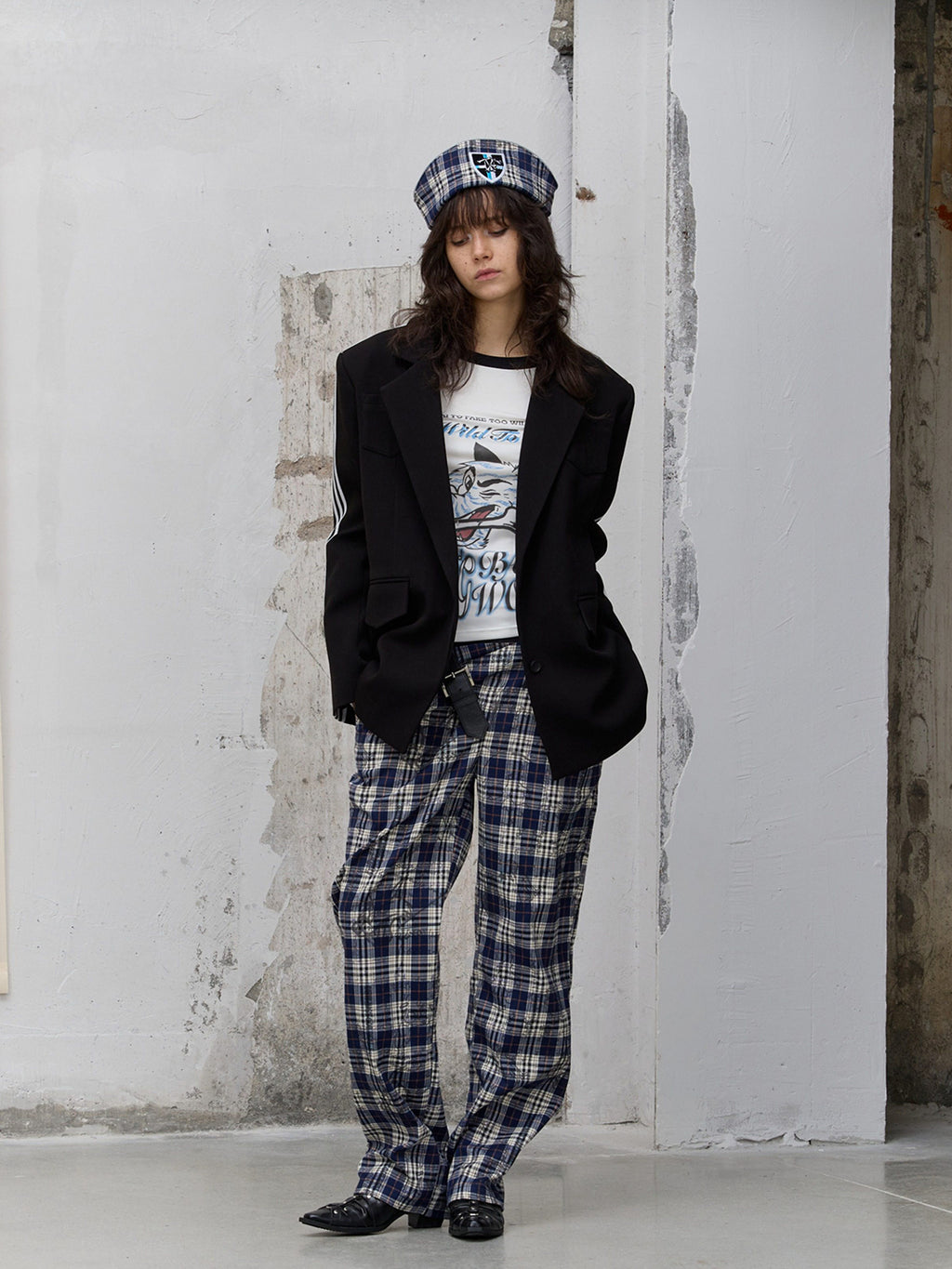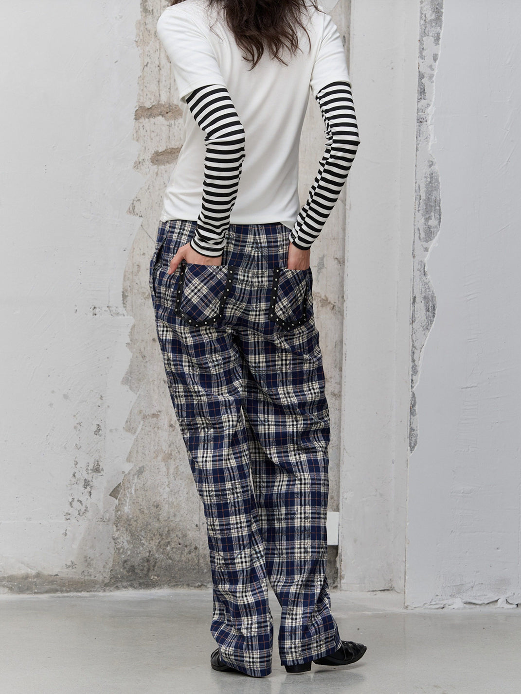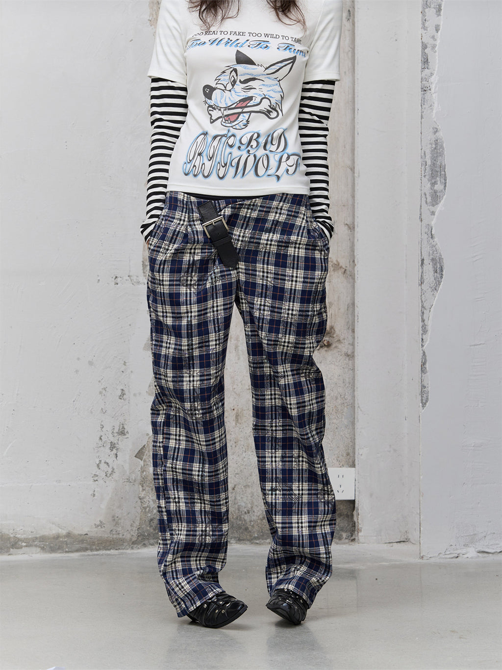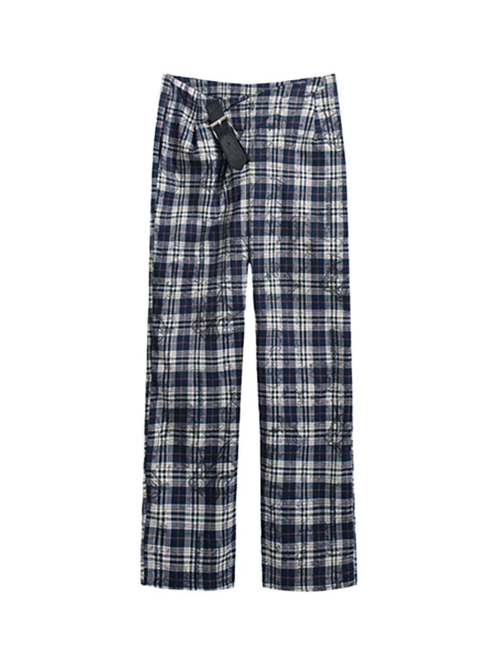 FULLTIDE | Leather Button-Up Pleated Plaid Trousers Skip to content