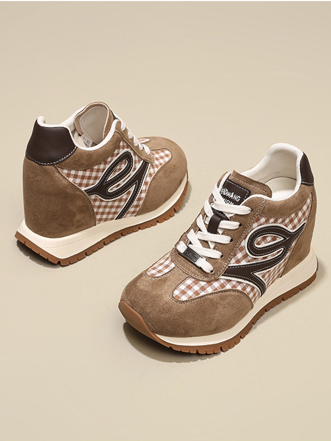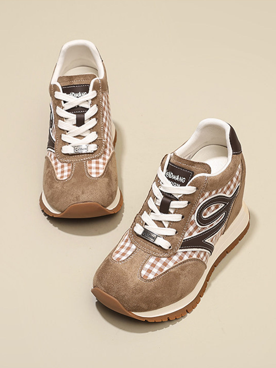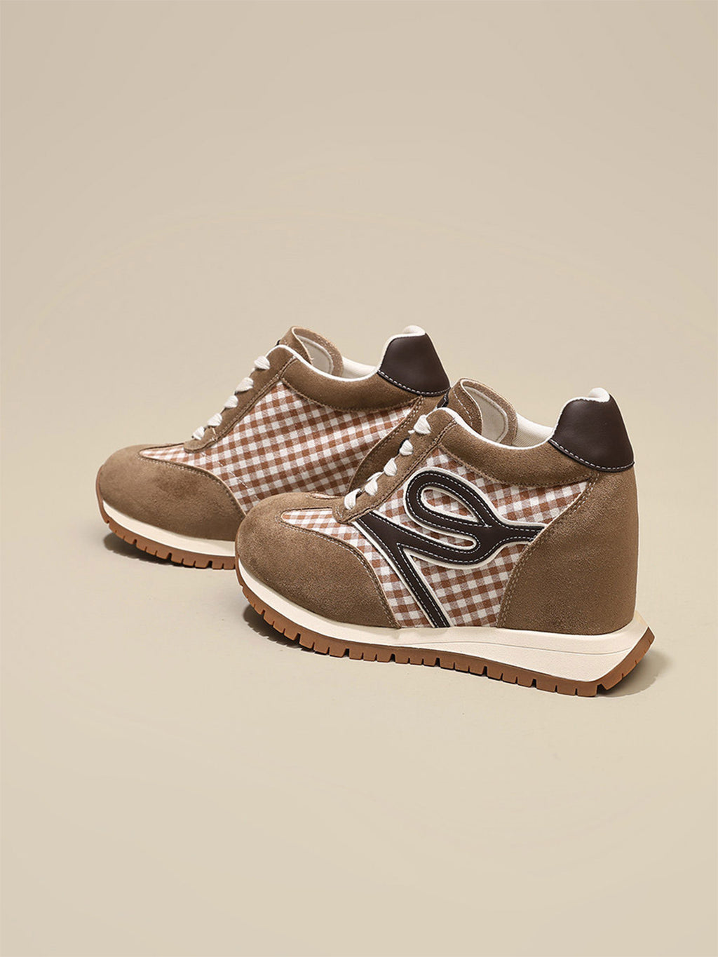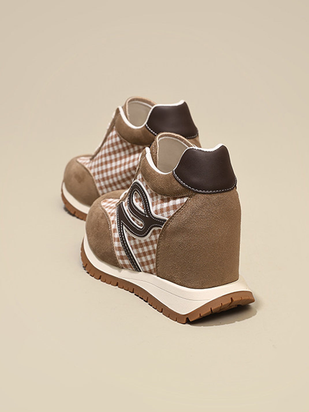 GRACE PANDA | Gingham Print Hidden Wedge Sneakers-Khaki Skip to content
