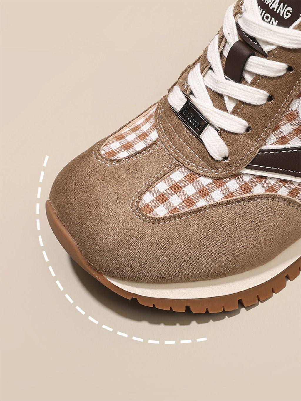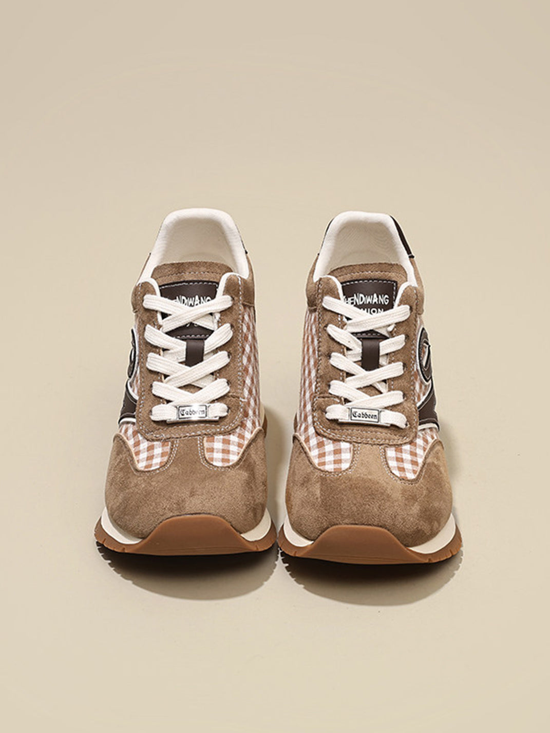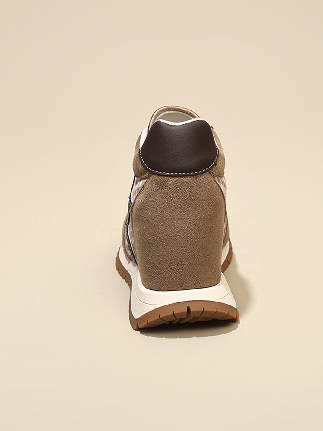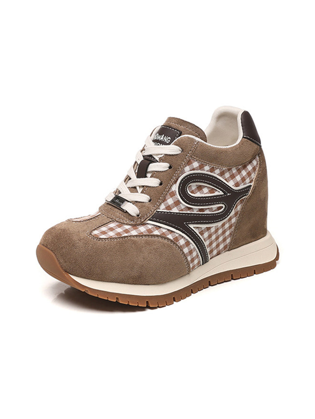 GRACE PANDA | Gingham Print Hidden Wedge Sneakers-Khaki Skip to content