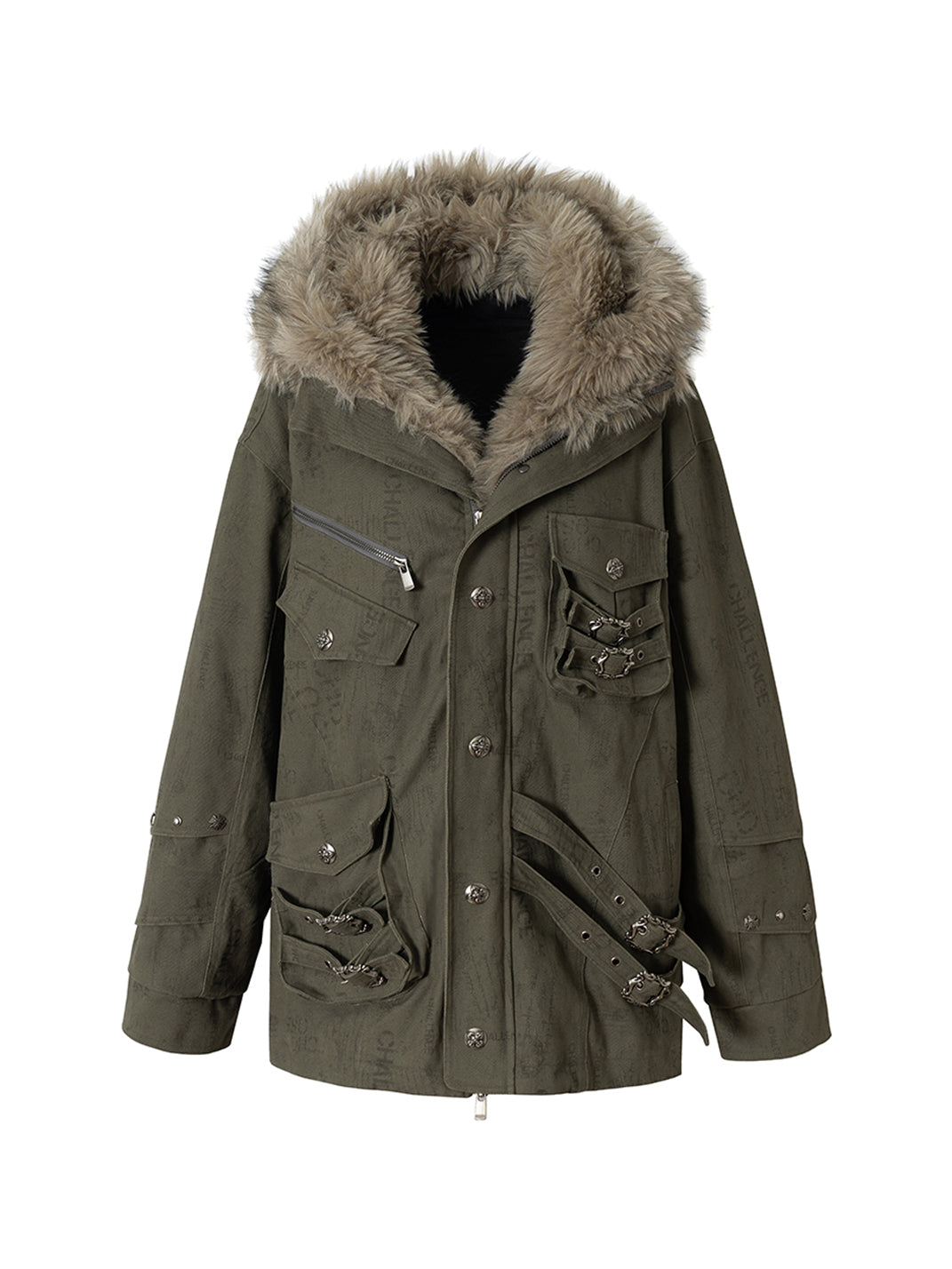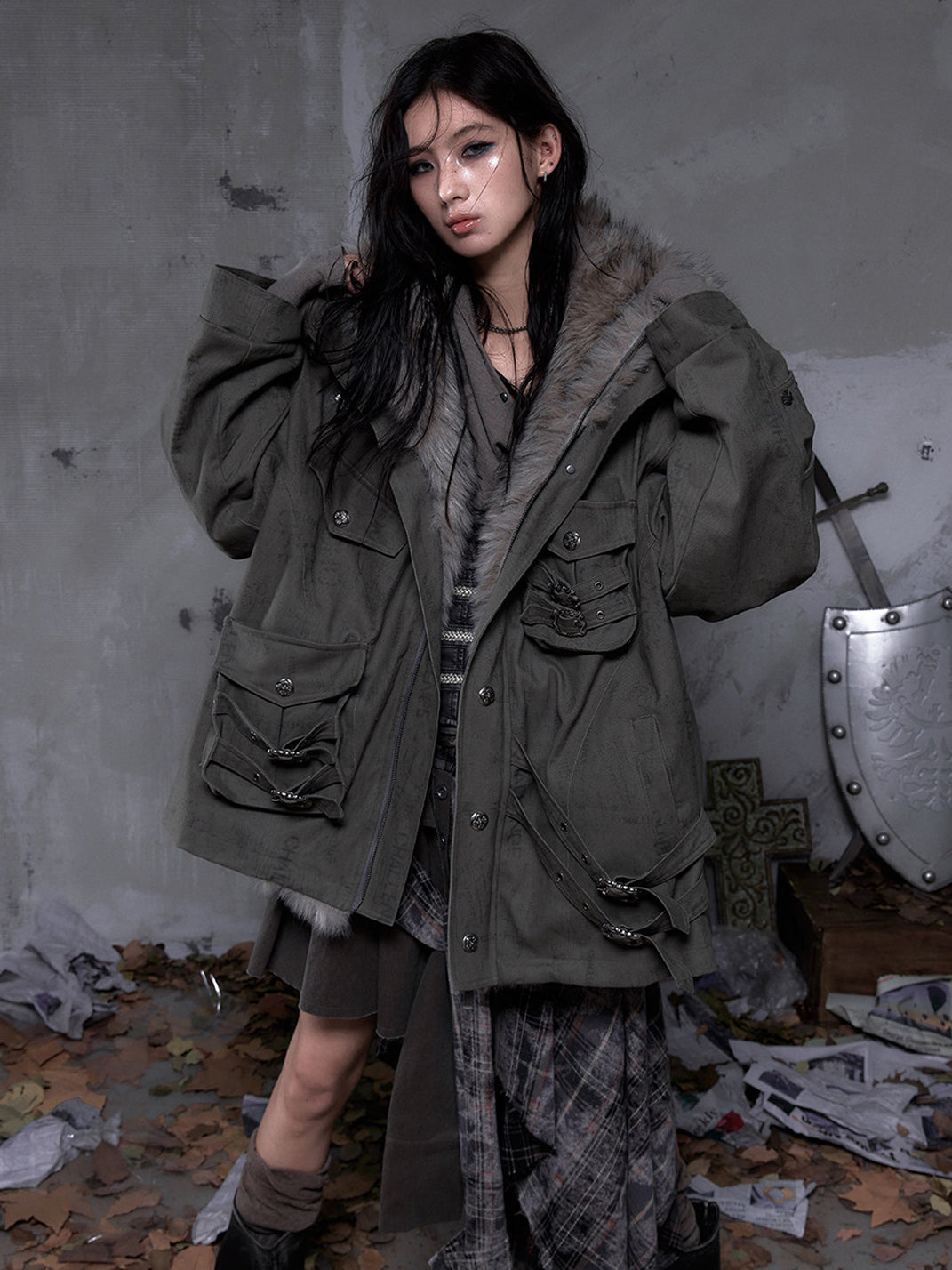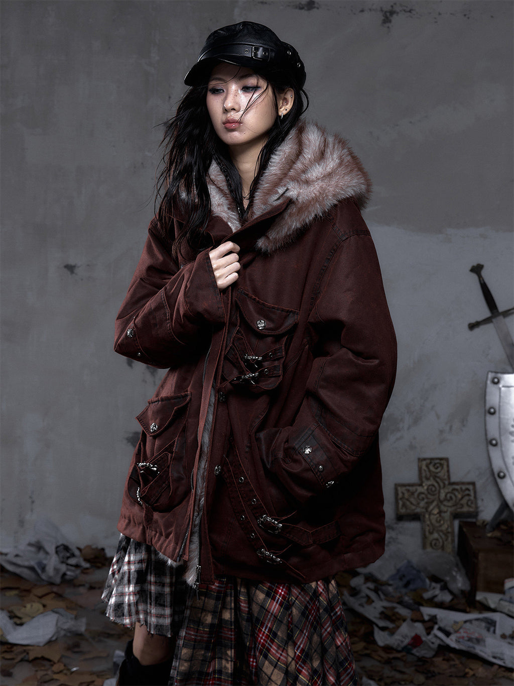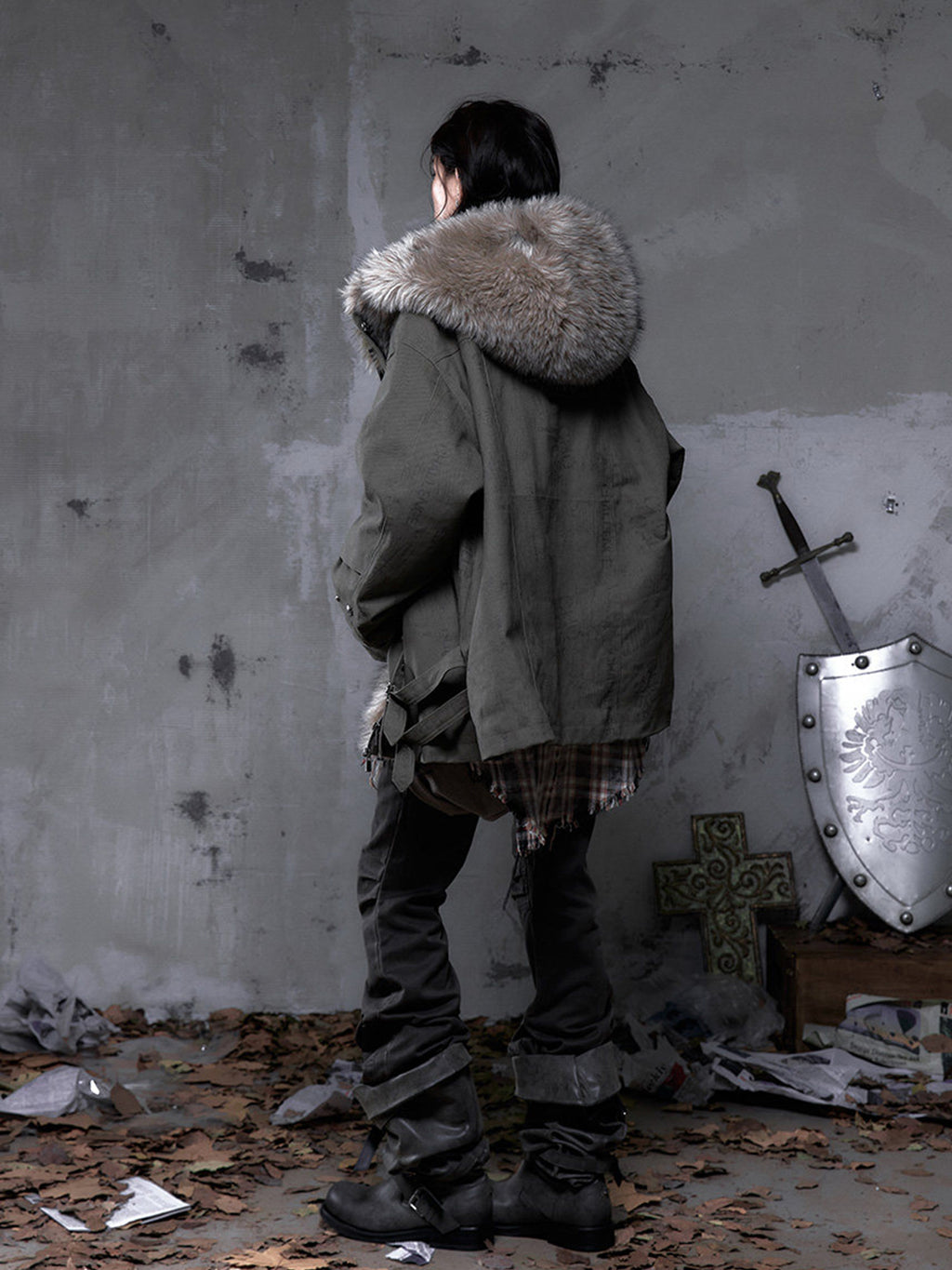 NO ROMANCE | Distressed 3D Pocket and Fur Collar Cotton Coat