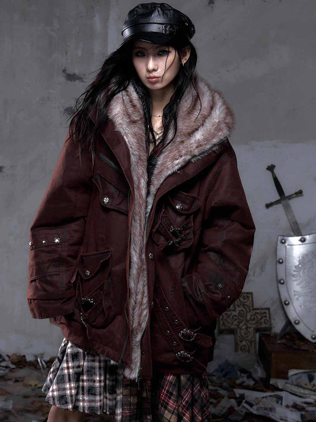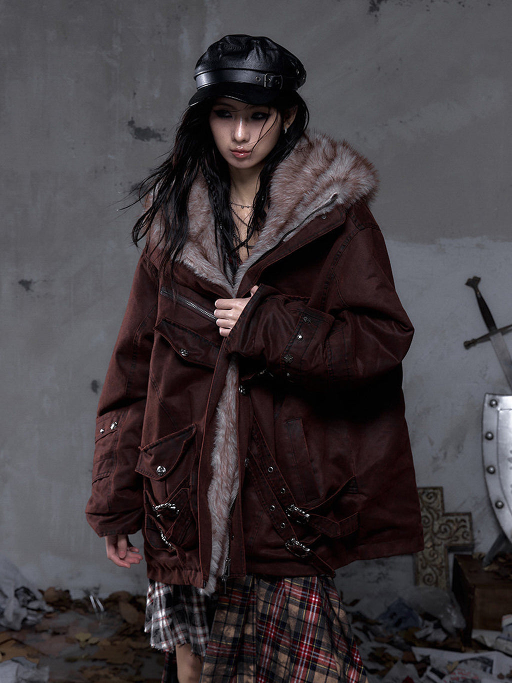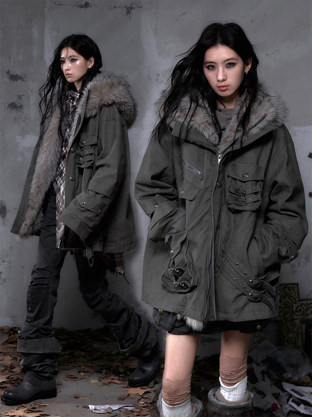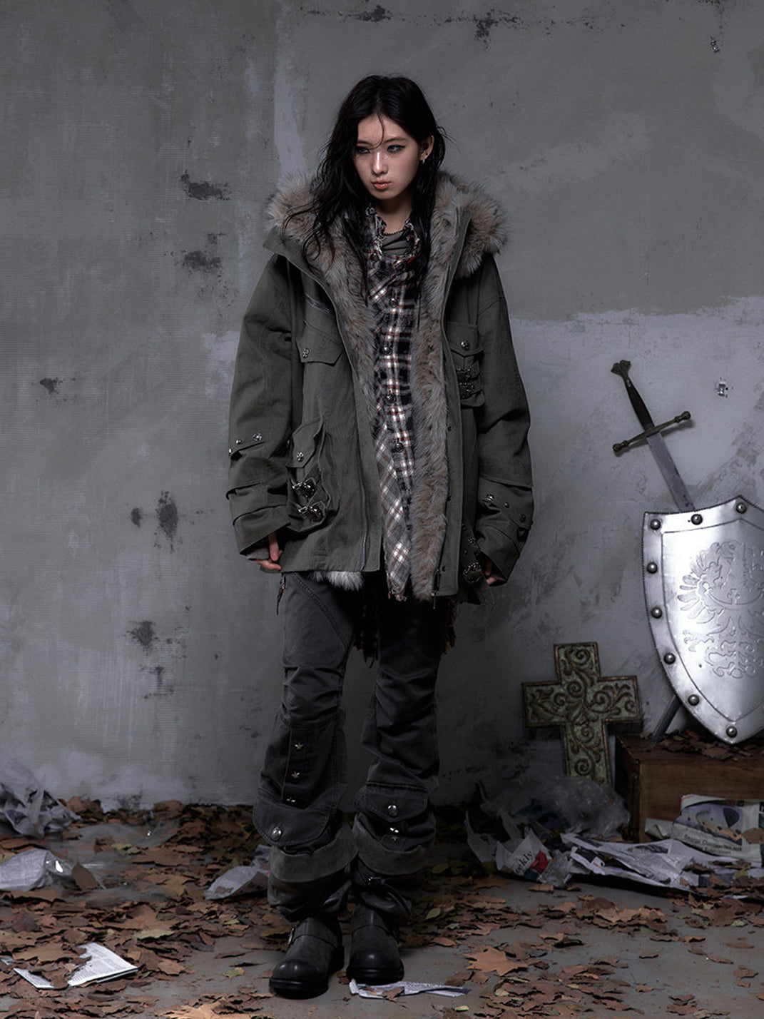 NO ROMANCE | Distressed 3D Pocket and Fur Collar Cotton Coat