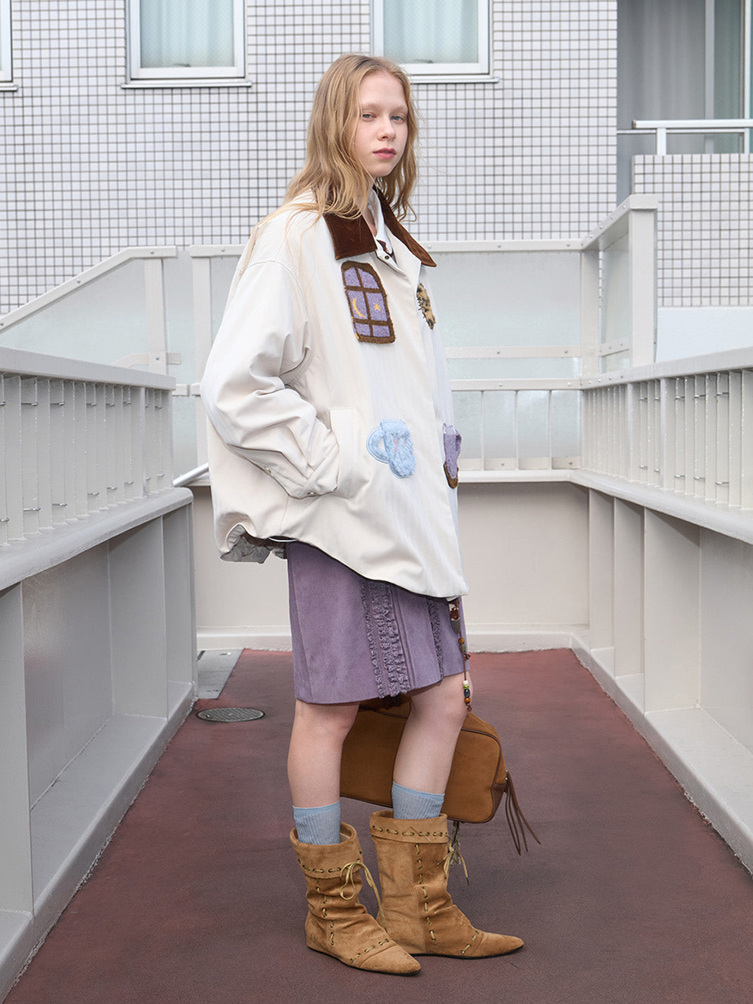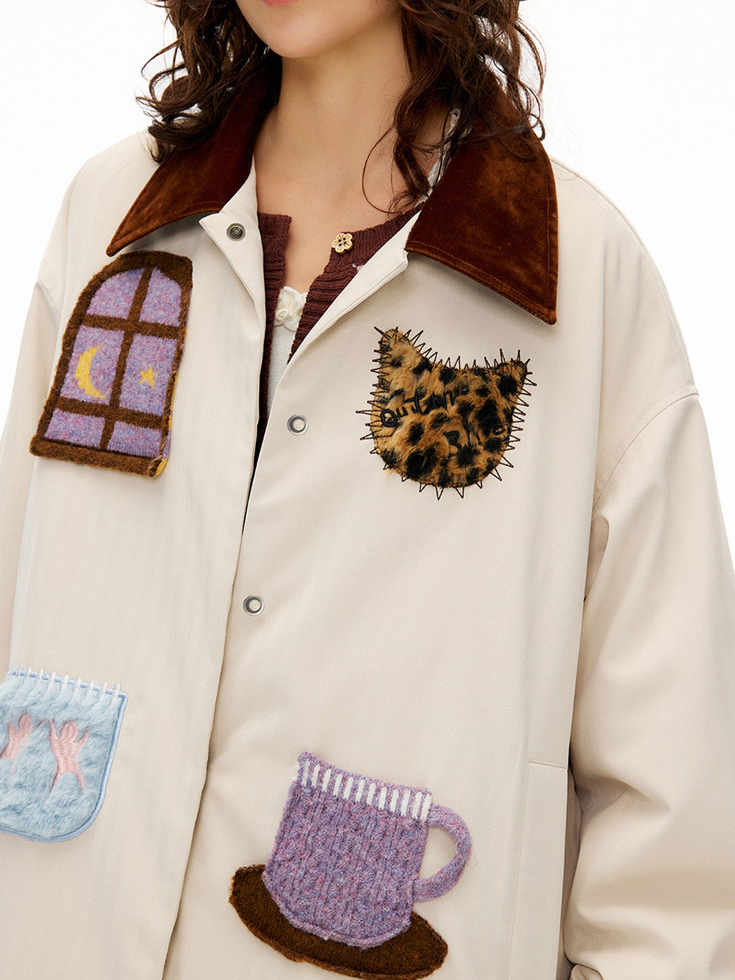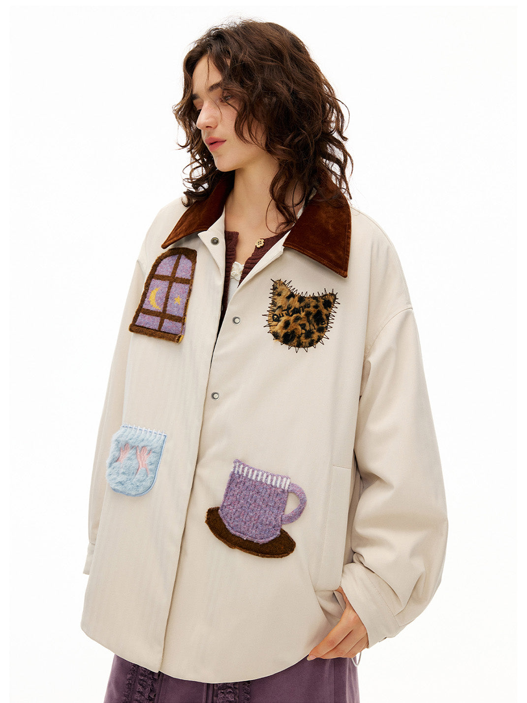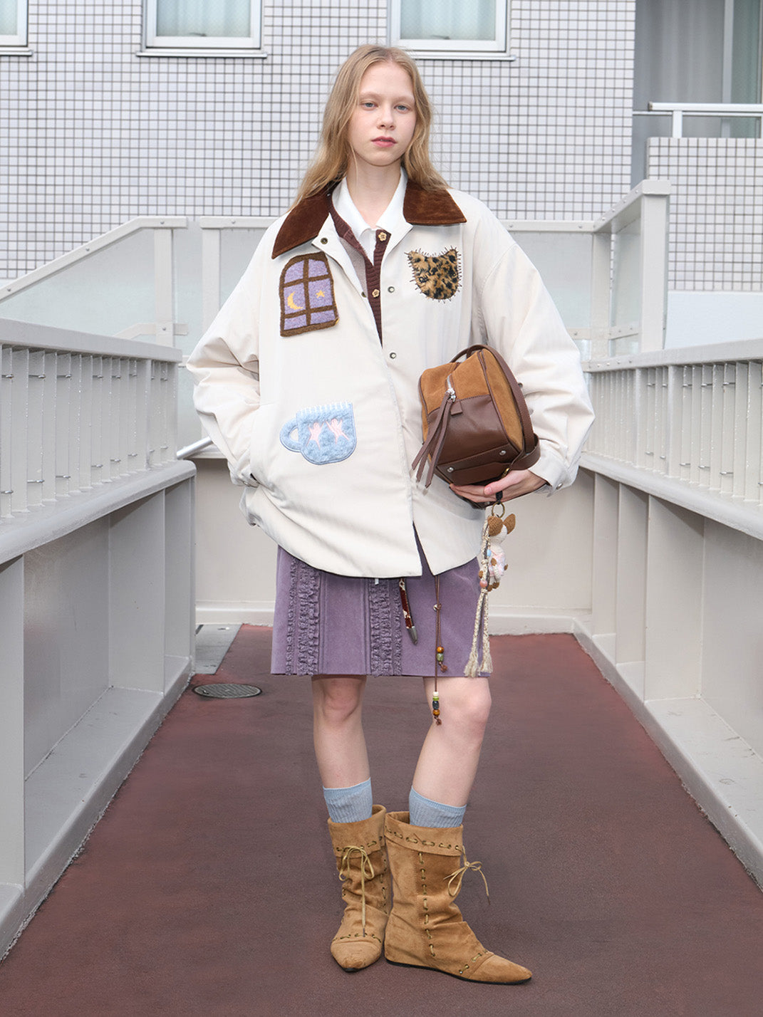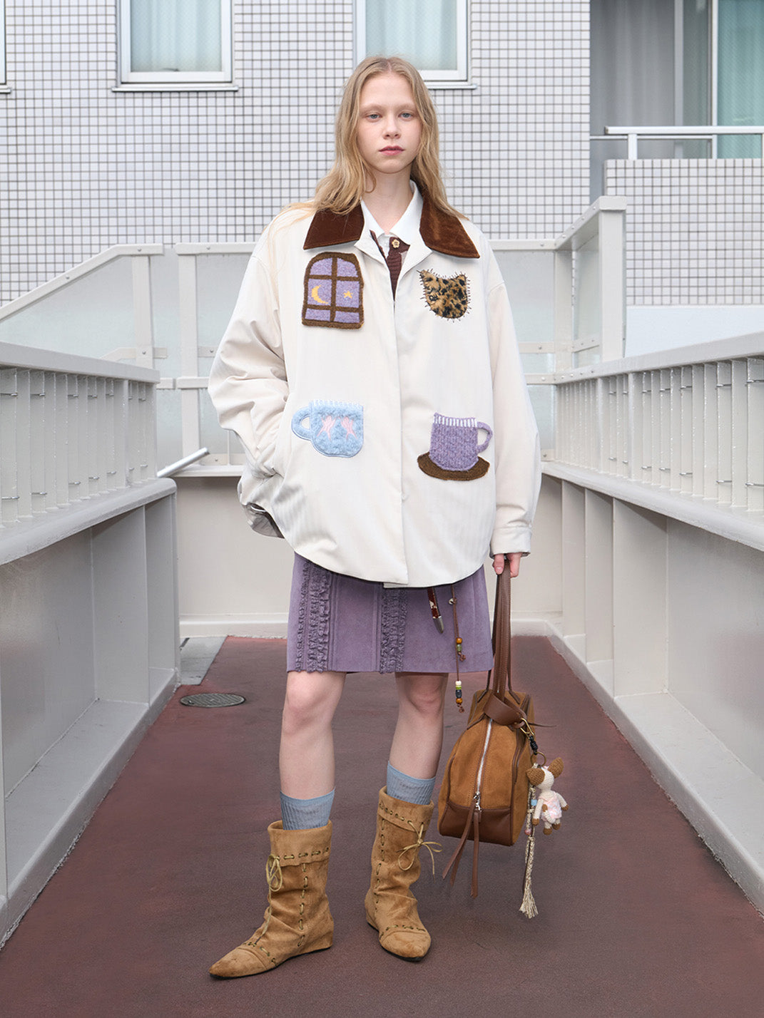 This down jacket features a relaxed, shirt-style silhouette with naturally dropped shoulders and a straight cut. It has a single-breasted front placket and elasticated back hem, maintaining a straight front while adding volume to the sides. Ample looseness at the hem and cuffs ensures a comfortable and unrestricted fit, perfect for layering with sweaters. The collar is made of dark brown suede, contrasting with the lighter cotton-like fabric of the main body. The front is adorned with intricately crafted knitted appliqués: a windowpane on the right chest, a leopard-print cat head on the left chest, and purple and blue coffee cups on the hem, all pieced together from knitwear and faux fur, adding both decorative and playful touches. Inspired by a nighttime café by a window, the design uses the combination of windows, cats, and hot drinks to create a warm and whimsical narrative atmosphere, striking a balance between comfort and storytelling.