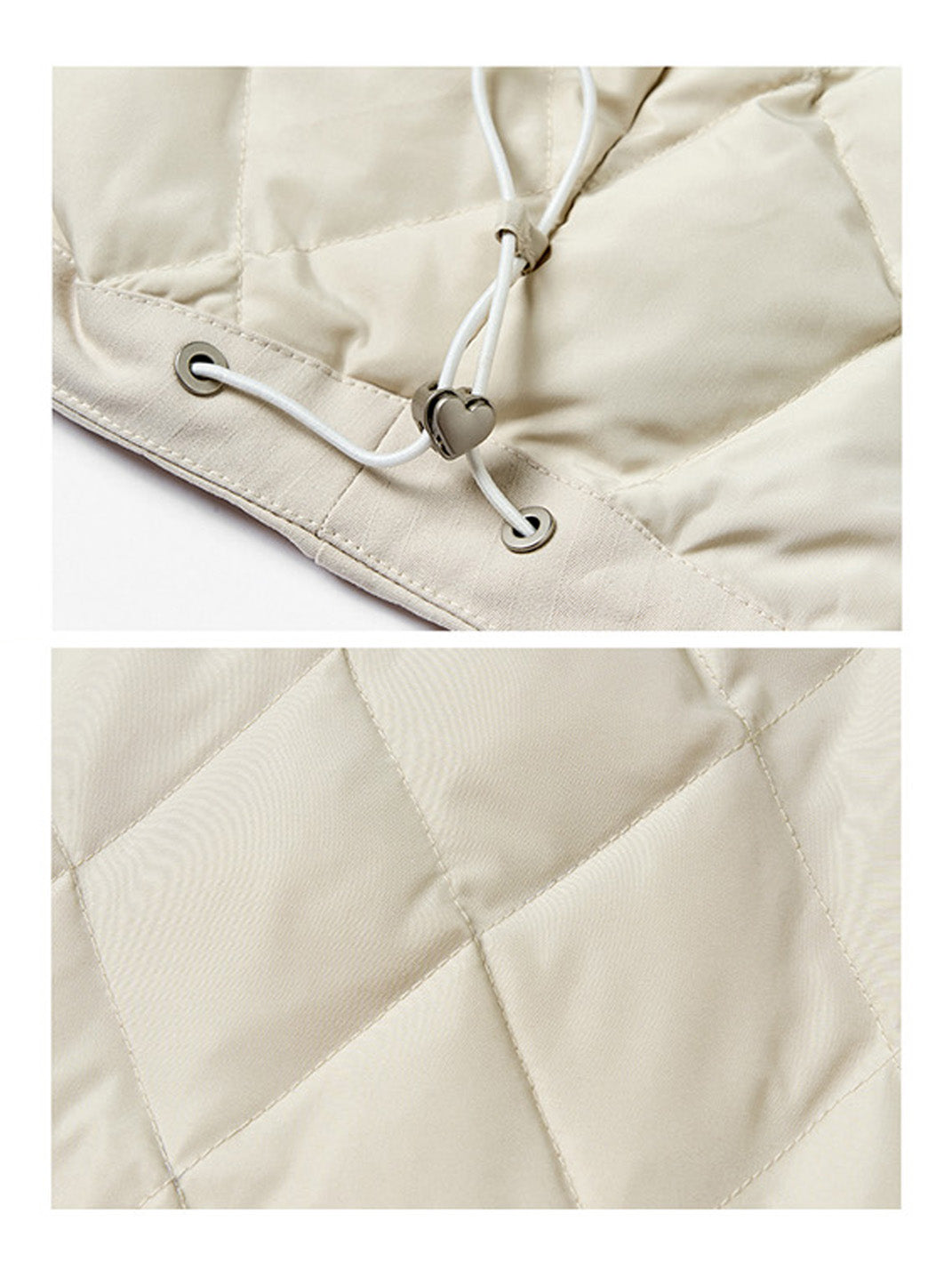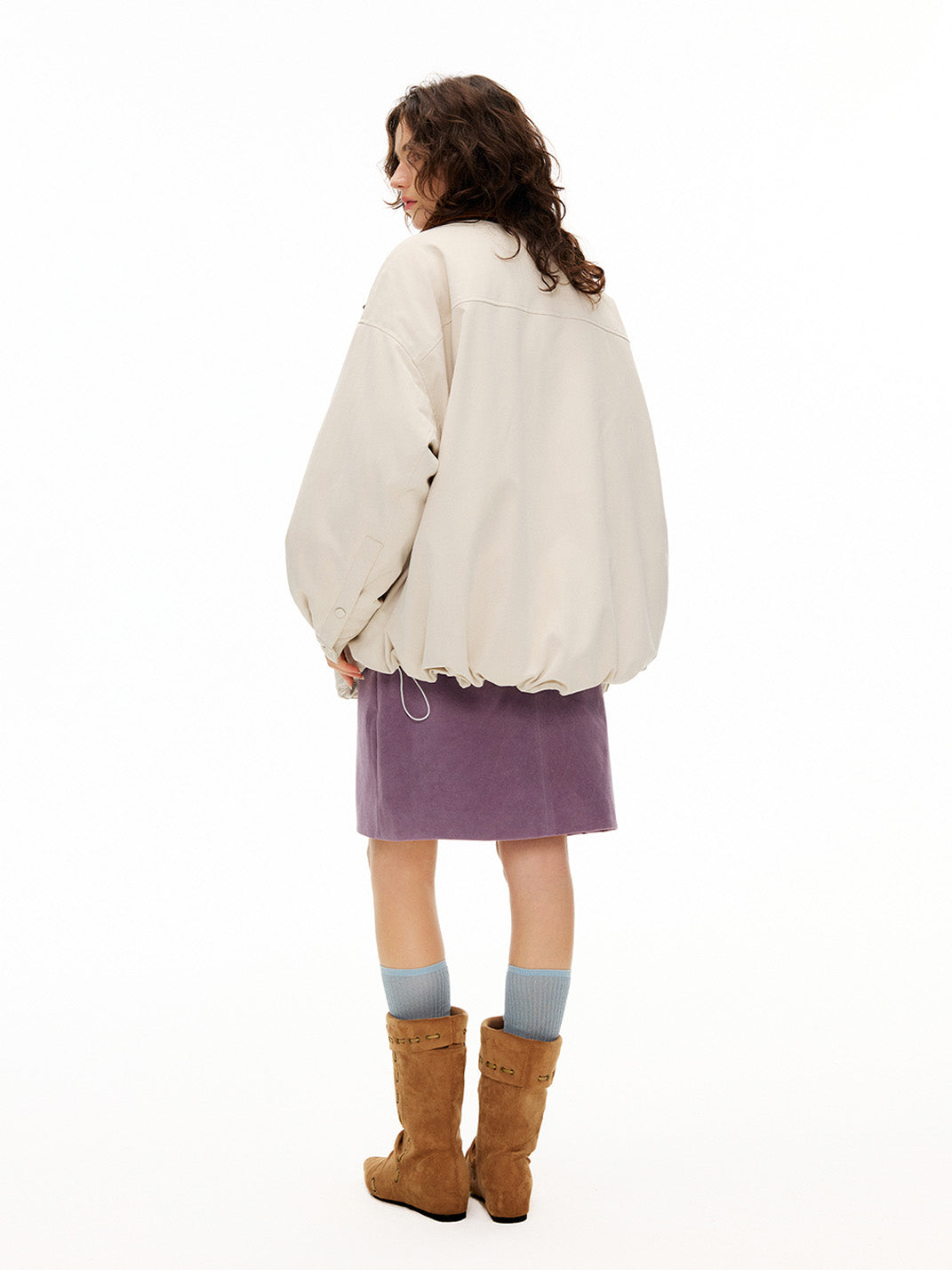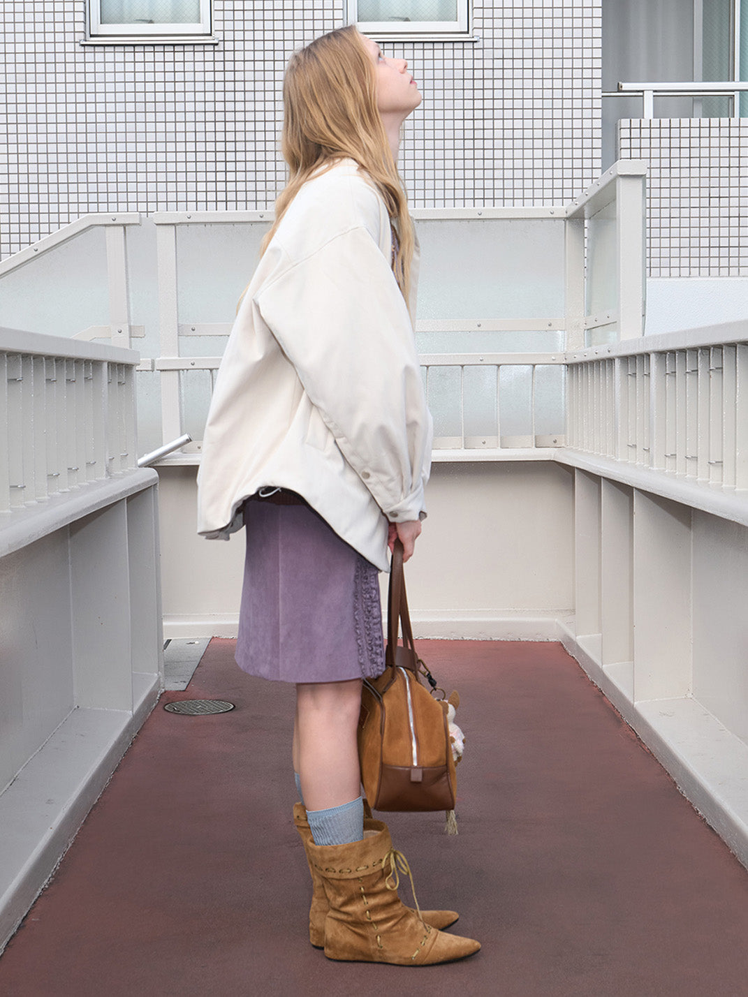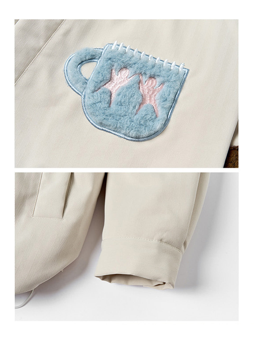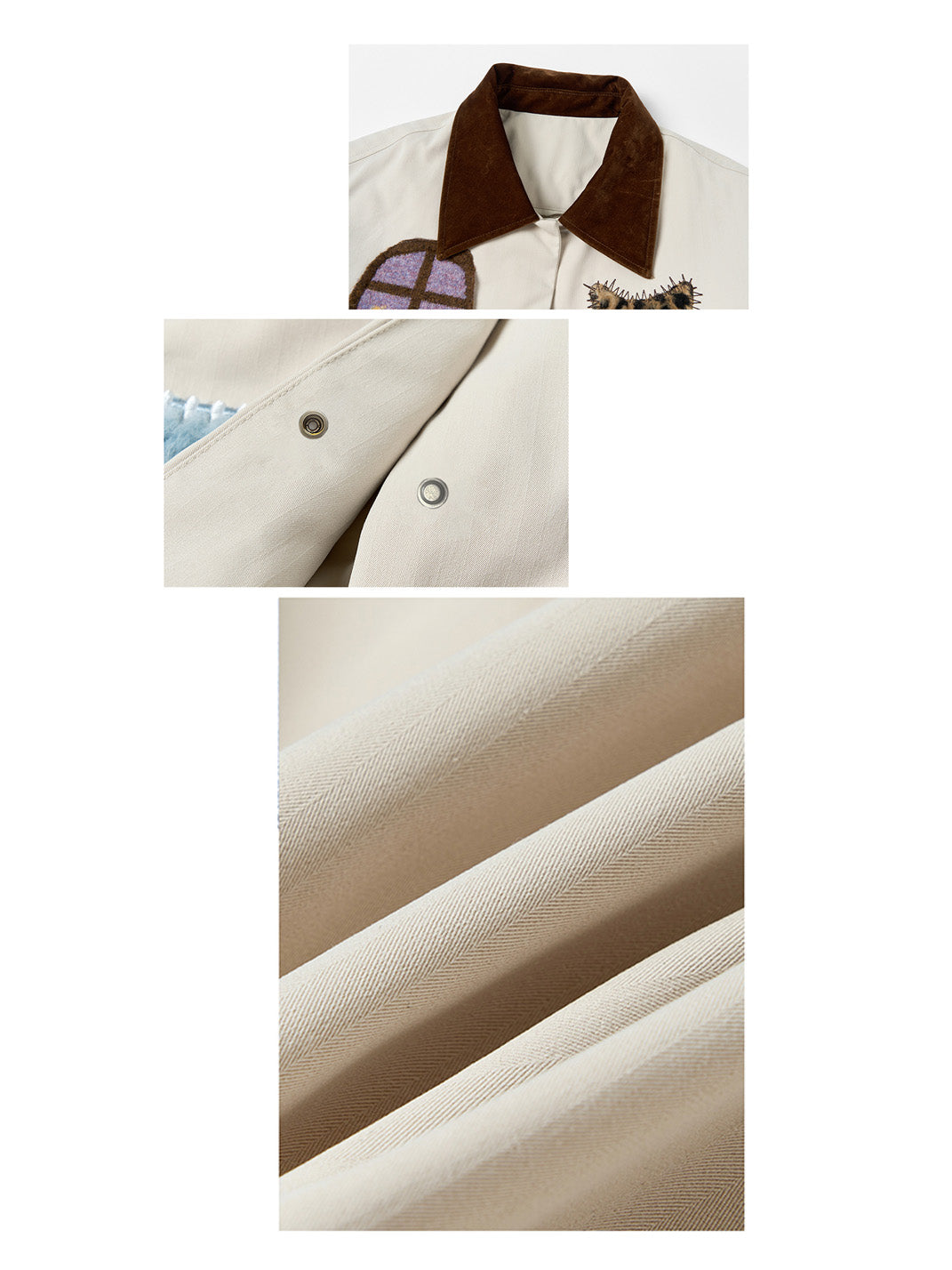 This down jacket features a relaxed, shirt-style silhouette with naturally dropped shoulders and a straight cut. It has a single-breasted front placket and elasticated back hem, maintaining a straight front while adding volume to the sides. Ample looseness at the hem and cuffs ensures a comfortable and unrestricted fit, perfect for layering with sweaters. The collar is made of dark brown suede, contrasting with the lighter cotton-like fabric of the main body. The front is adorned with intricately crafted knitted appliqués: a windowpane on the right chest, a leopard-print cat head on the left chest, and purple and blue coffee cups on the hem, all pieced together from knitwear and faux fur, adding both decorative and playful touches. Inspired by a nighttime café by a window, the design uses the combination of windows, cats, and hot drinks to create a warm and whimsical narrative atmosphere, striking a balance between comfort and storytelling.