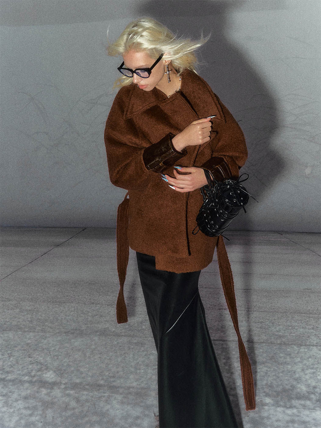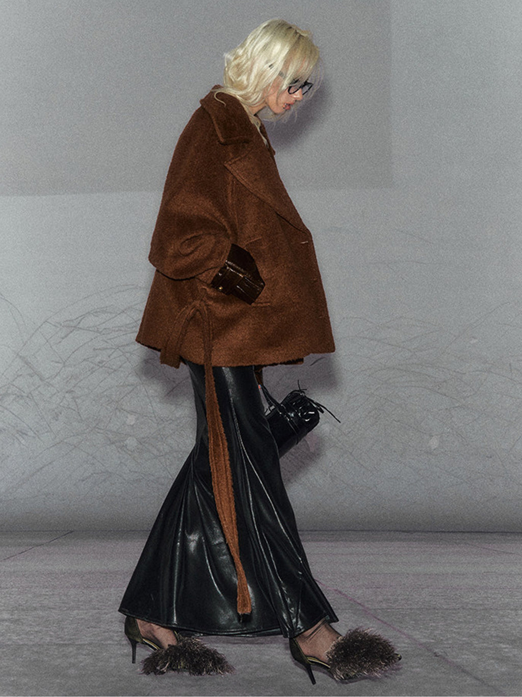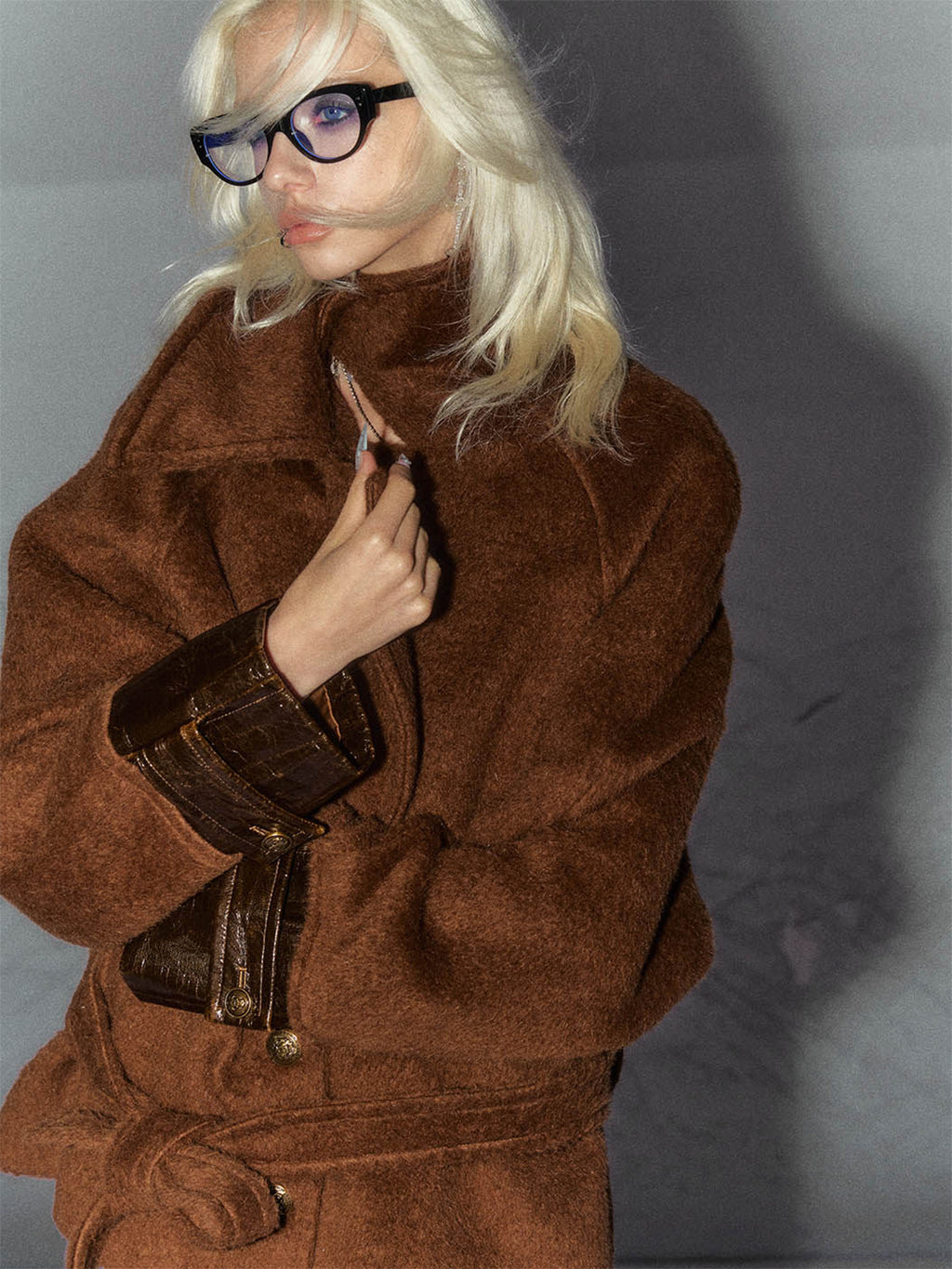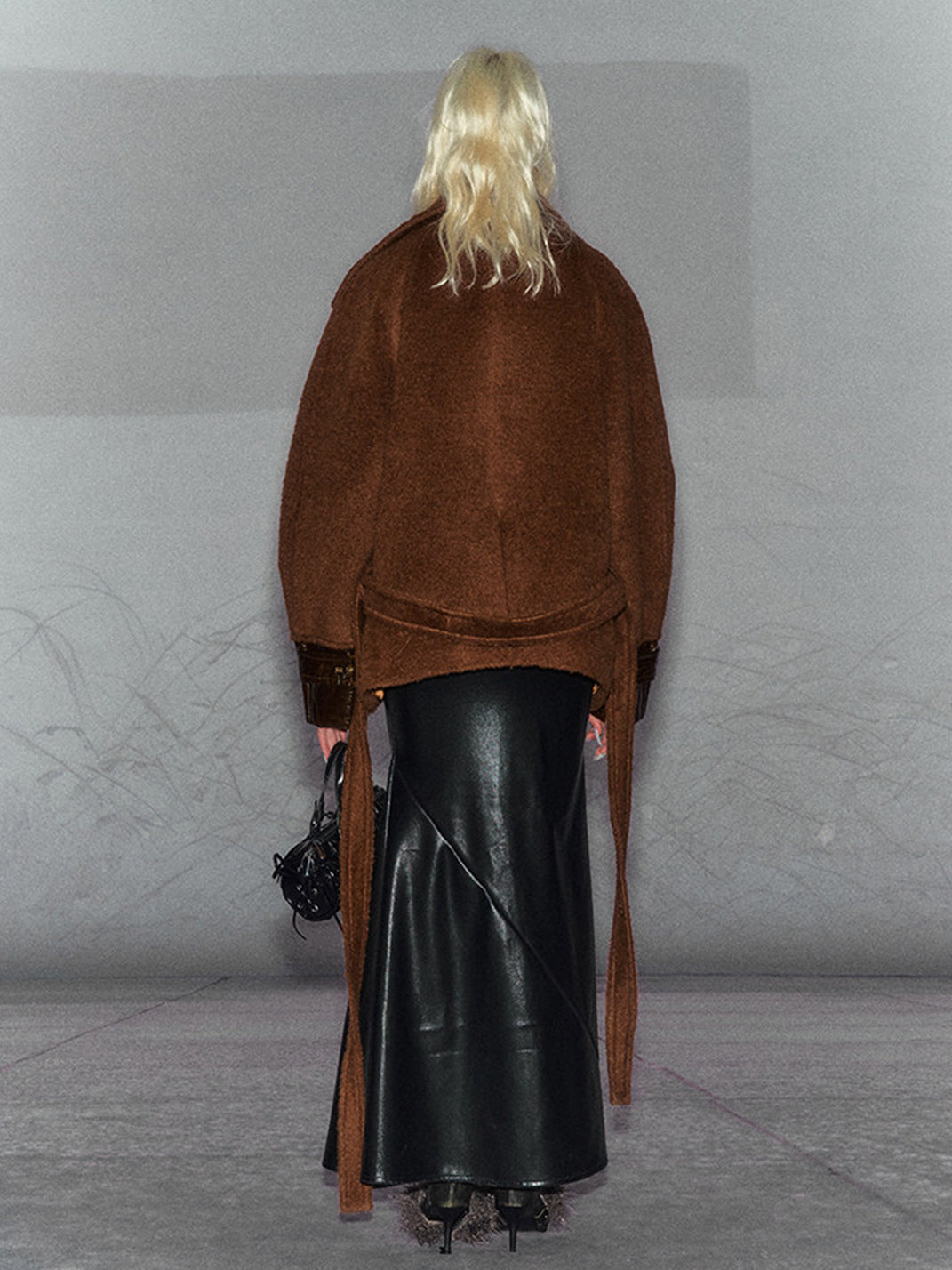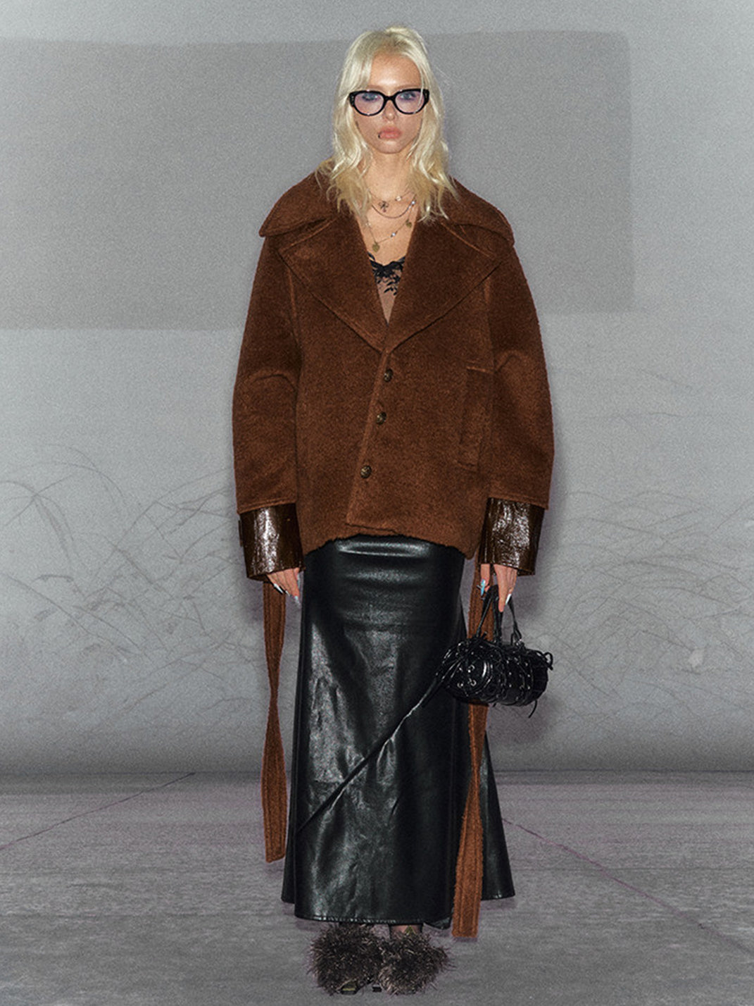 This short coat features a brown main body, a classic and versatile color that flatters the wearer's skin tone. The cuffs are trimmed with leather, a durable and wrinkle-resistant material that enhances the coat's longevity and texture. The leather contrasts sharply with the wool main body, adding a touch of style and sophistication. The large lapel design exudes elegance and beautifully accentuates the wearer's neck and face shape.